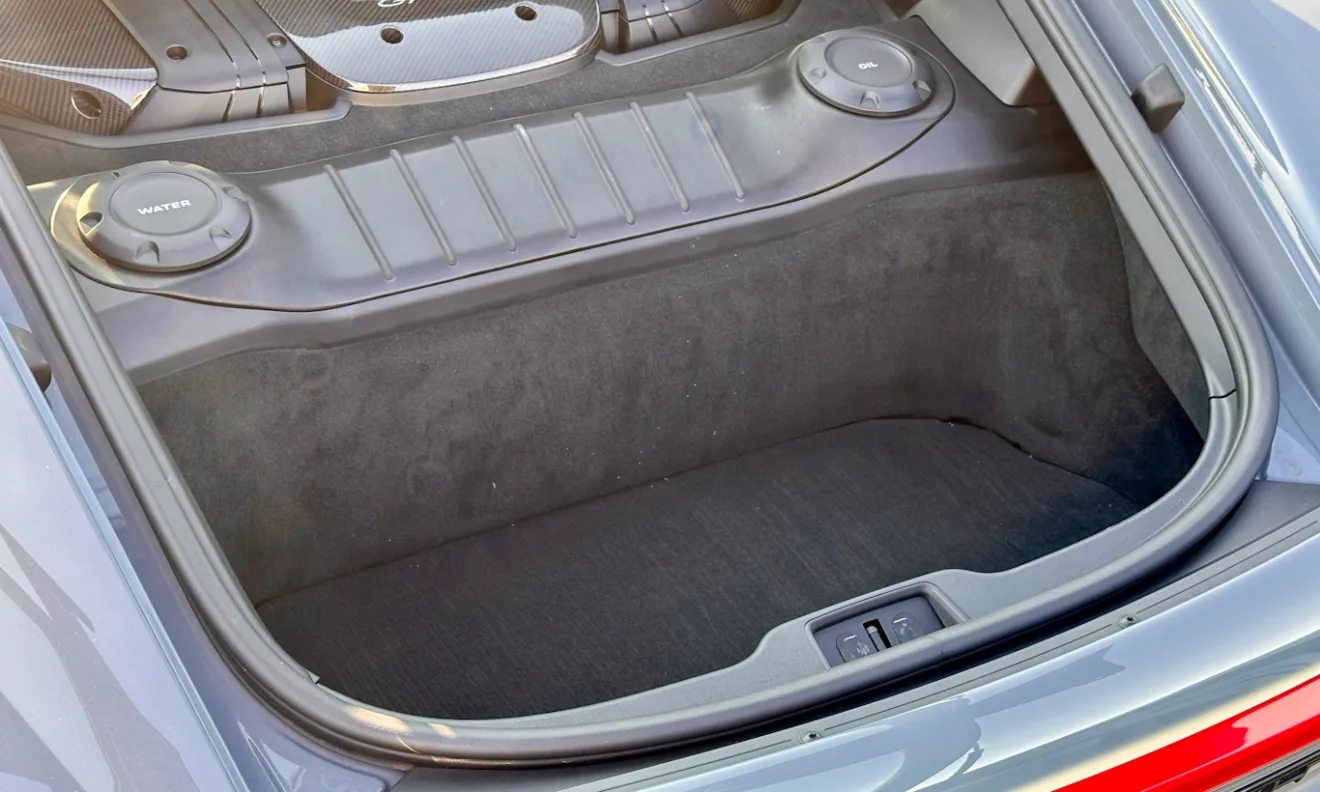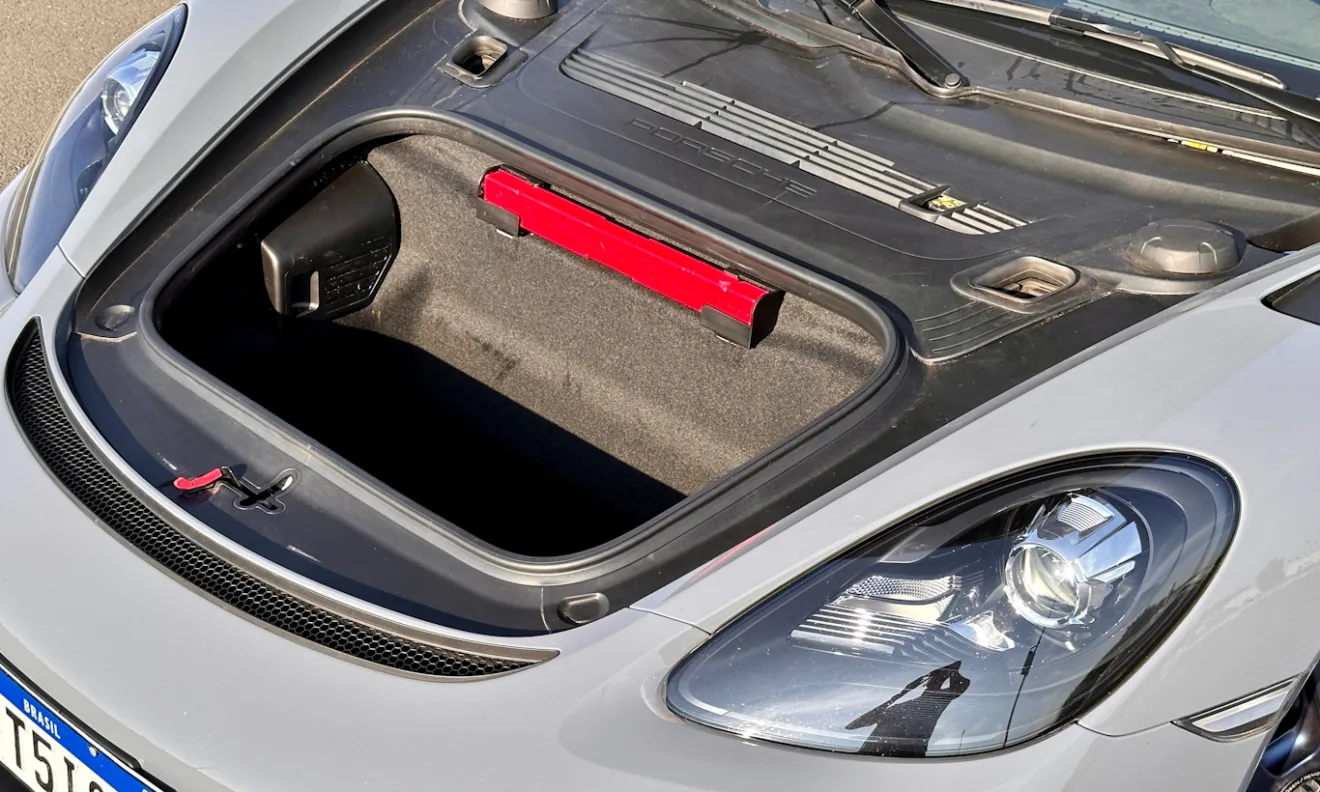 Já na traseira, ele leva 136 litros, o que ajuda um pouco, mas ainda é pequeno. Ali não há cobertura, deixando suas cargas expostas e dividindo espaço com o motor e componentes de suspensão. Além disso, a tampa é pesada para ser levantada por conta de toda a estrutura do aerofólio.