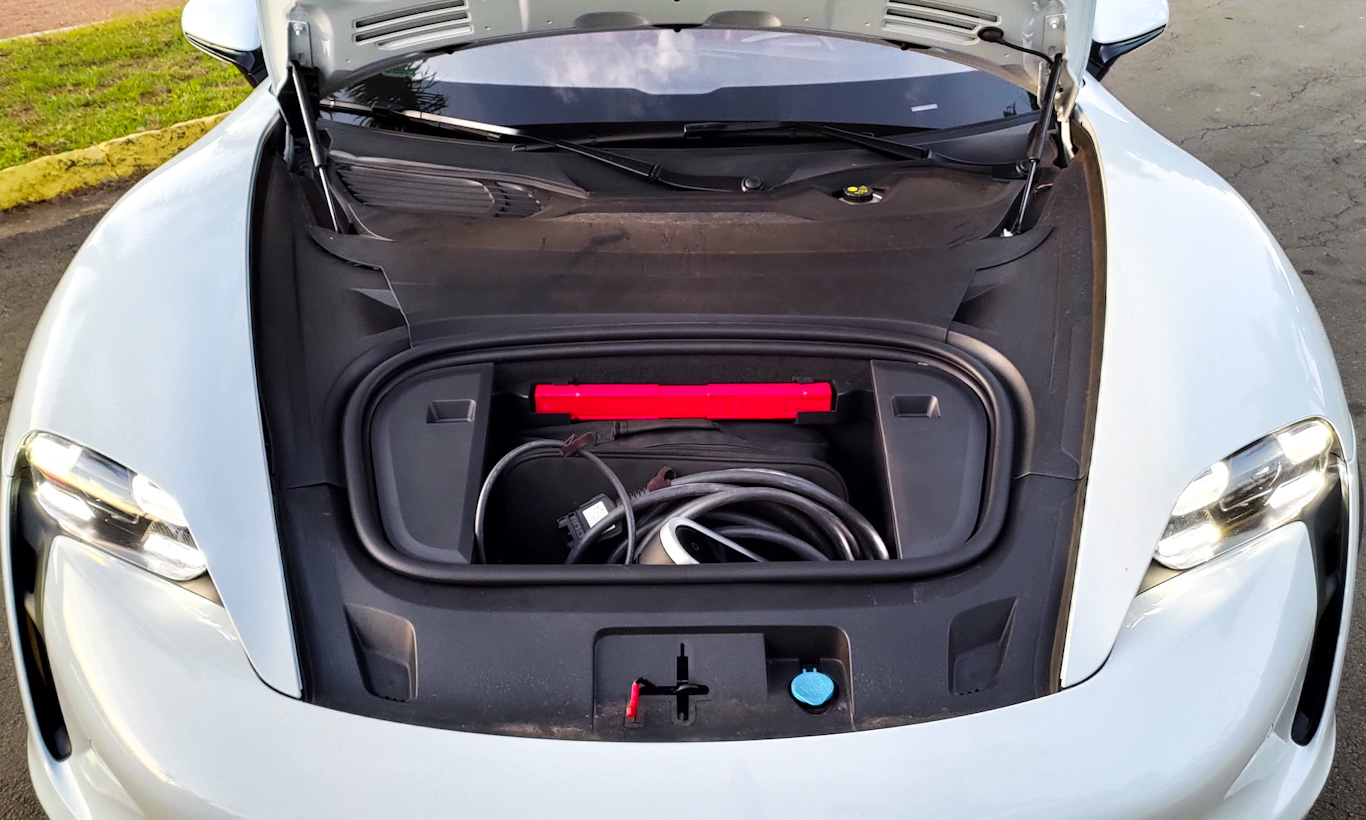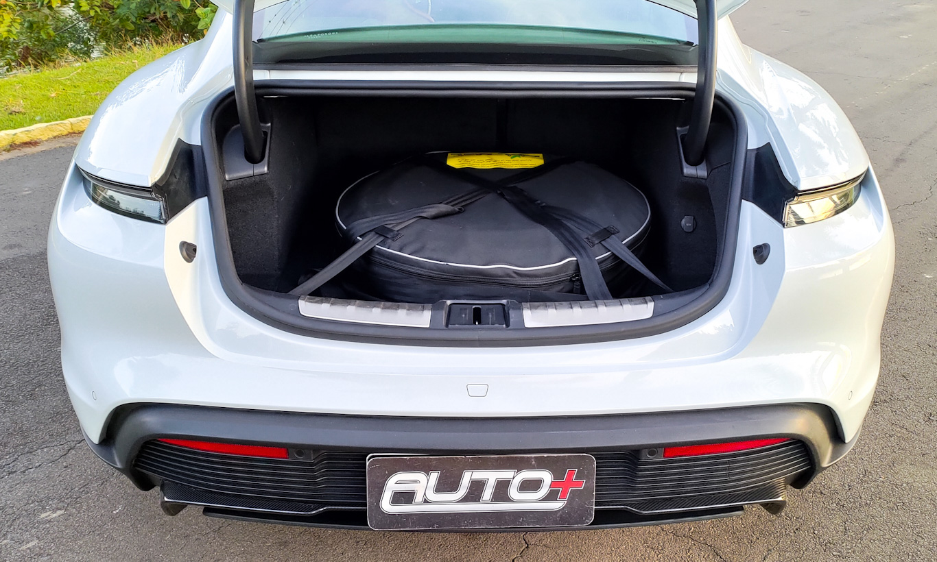 Por culpa dos motores elétricos, o Porsche Taycan tem dois porta-malas. O dianteiro carrega até 84 litros, mas fica praticamente lotado com os cabos de carregamento que vem de série com ele. Já atrás, os 366 litros são quase totalmente ocupados pelo estepe, que é item obrigatório no Brasil caso o carro não tenha pneus run-flat, caso do Taycan.