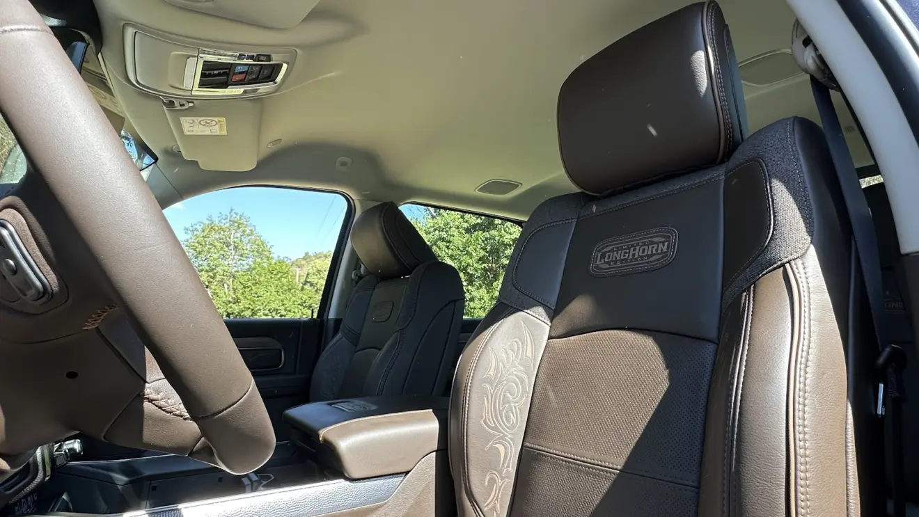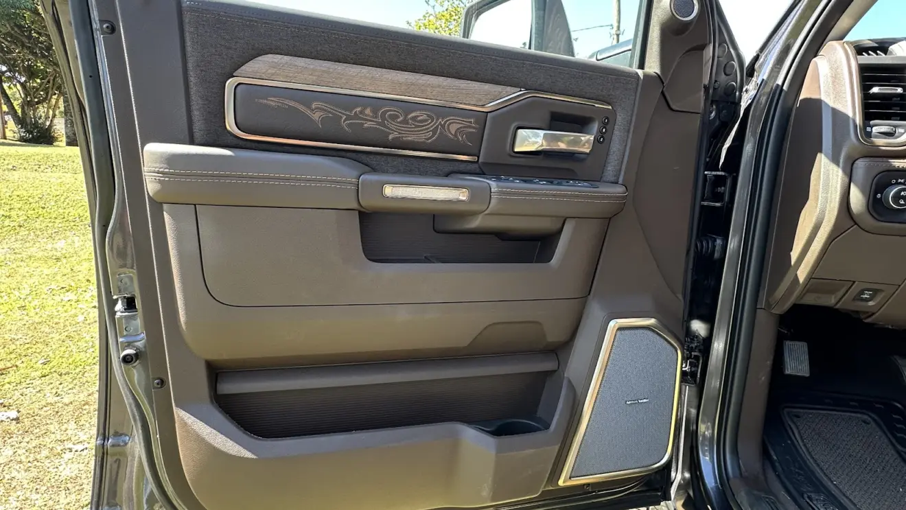 Há poucas áreas em plástico, e as laterais das portas, inteiramente revestidas, exibem costuras, madeira e alumínio. Sem dúvidas, o quesito luxo embarcado é um capítulo à parte na Ram 3500 Limited Longhorn. Ou seja, uma vez a bordo, a sensação é de que o investimento de R$ 679.990 na caminhonete valeu a pena.