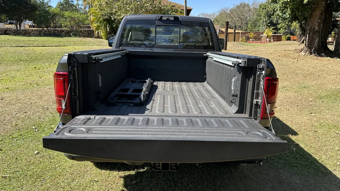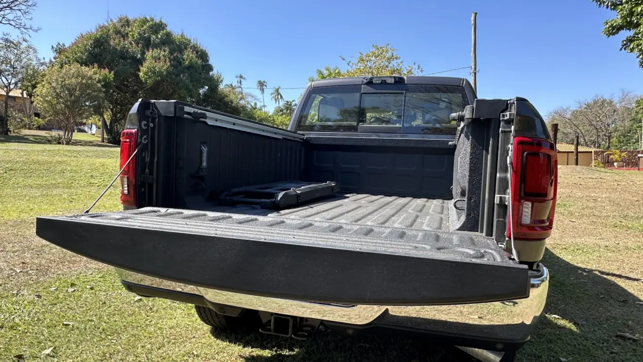 Quem procura uma caminhonete quer saber da caçamba — e aqui não há decepção. A Ram 3500 Limited Longhorn carrega até 1.599 kg e pode rebocar até 9.079 kg com reboque com freio. A caçamba mede 1,93 m de comprimento, 51,1 cm de altura e 1,29 m de largura. O revestimento interno é poroso, ajudando a evitar riscos ou demais danos na área de carga.