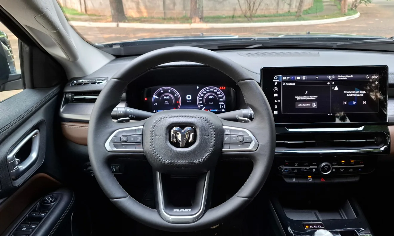 A qualidade do banco também é boa, apoiando bem o corpo do motorista. Sobre o acabamento, a versão Laramie tem detalhes em um tom caramelo que dão à Ram Rampage um aspecto de carro americano, algo que combina com a pegada da sua fabricante. Há bons materiais na cabine, os encaixes são precisos e o acabamento agrada o olhar e o toque.