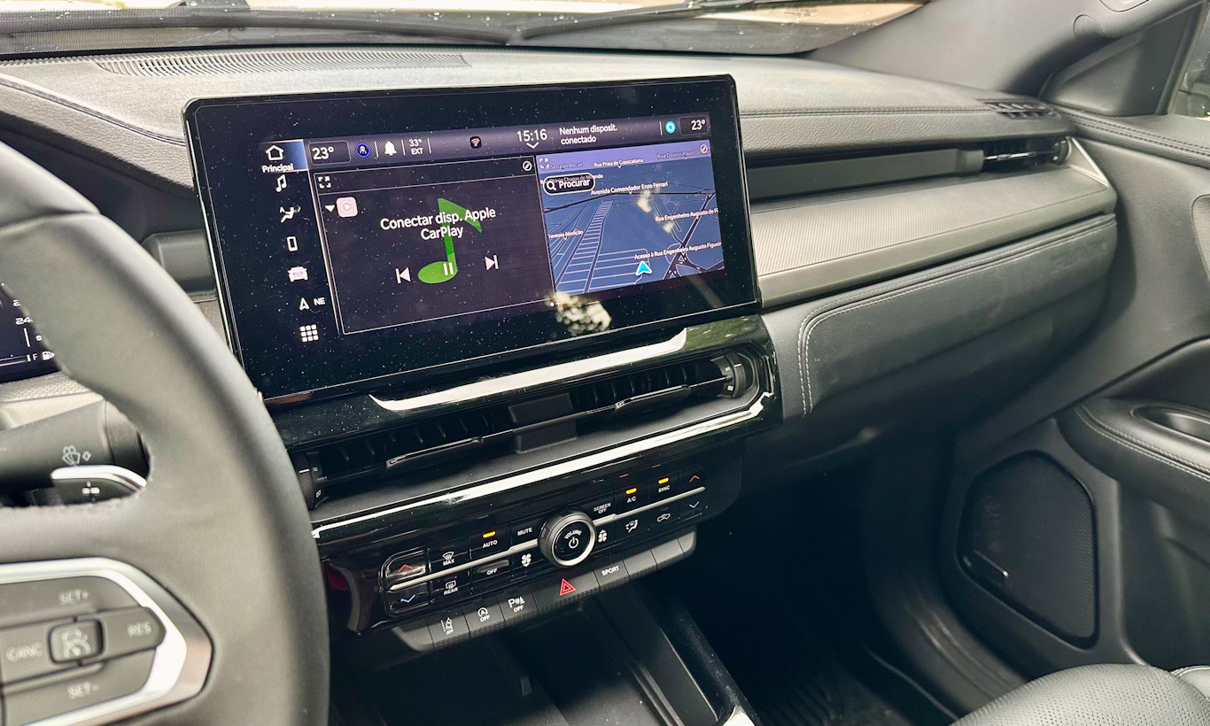 Há de elogiar o painel de instrumentos totalmente digital que tem tela de melhor definição e mais recursos do que o de outros modelos da Stellantis feitos no Brasil. Além disso, a central multimídia é bonita, com tela grande e funciona com facilidade e velocidade. Conta com Android Auto e Apple CarPlay sem fio, além de possibilitar conexão via cabo USB C ou USB normal.