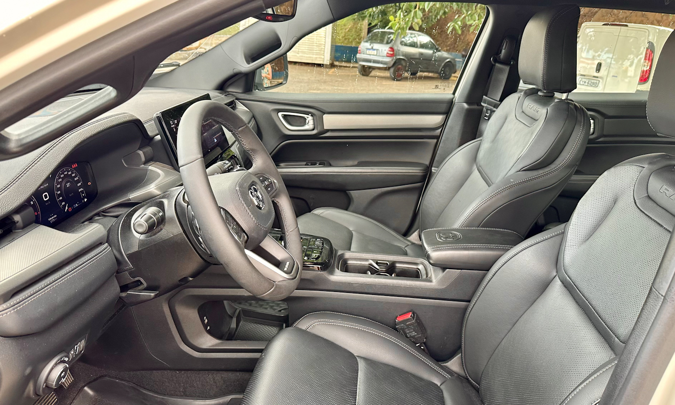 No painel, a parte superior toda macia é a mesma peça do Compass e do Commander. Contudo, ela tem uma faixa de couro com o logotipo da Ram e outra texturizada que dão um ar diferenciado. Console central alto com manopla de câmbio rotativa é outro charme da picape.