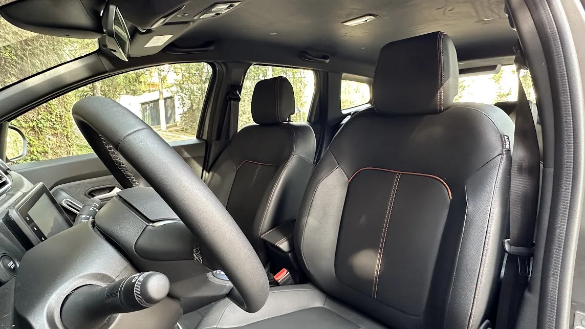 A cabine, bem-feita desde 2020, na versão Iconic Plus, apresenta as ilhas das portas dianteiras revestidas e acolchoadas (não visto nas traseiras), o uso de plásticos de boa qualidade e detalhes imitando alumínio. Nem parece a primeira versão de 2011, quando compartilhava muitos elementos com a dupla Logan/Sandero.