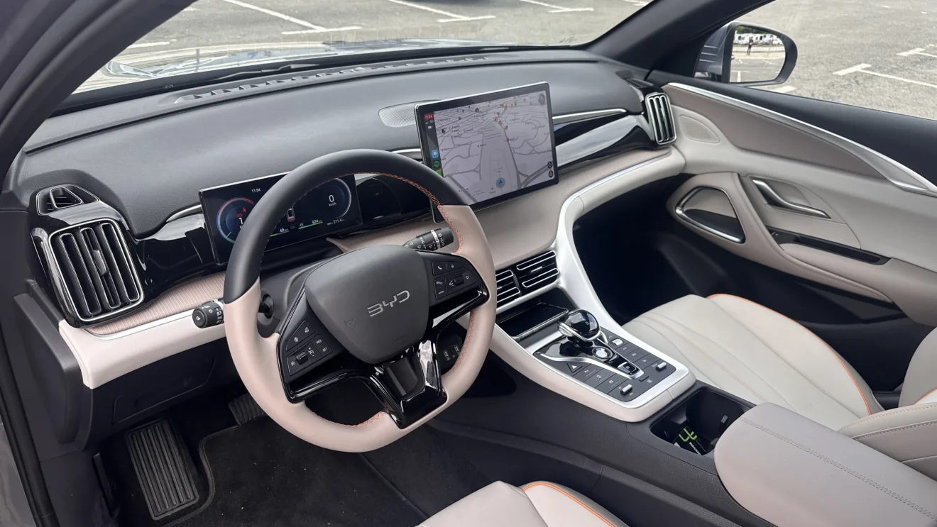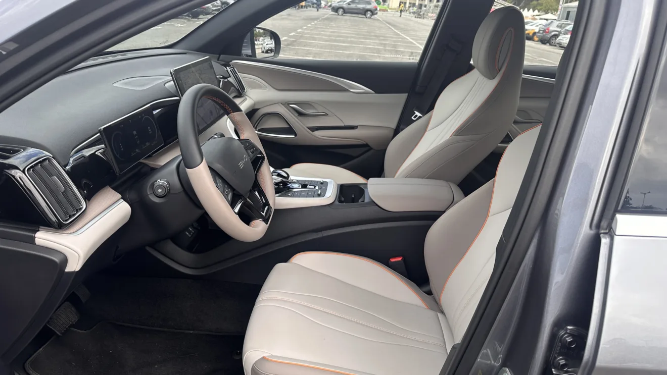 Por dentro, o BYD Song Pro chama atenção pelo ótimo acabamento. A porta é revestida de material macio com várias texturas diferentes, assim como o painel. A parte preta é emborrachada, enquanto couro macio é usado na tonalidade bege e café com leite. Uma faixa texturizada no painel também é macia e todos os encaixes são bem feitos.