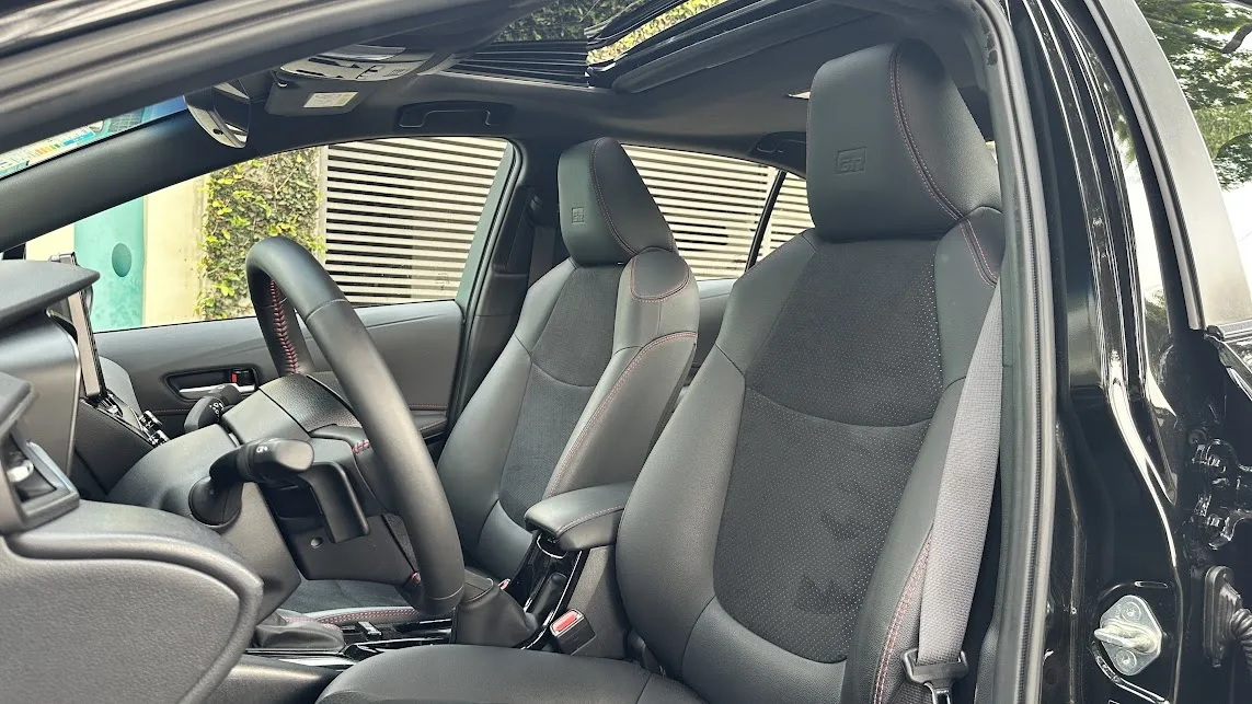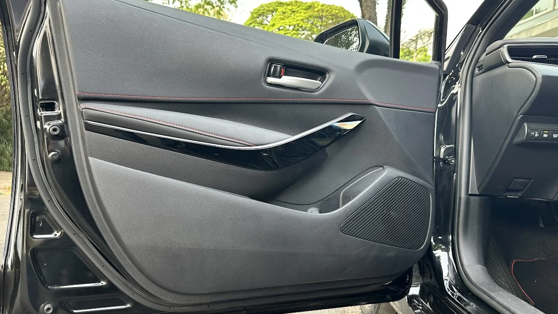 Os passageiros traseiros encontram bom espaço para pernas e joelhos, com os encostos rebatíveis na proporção 60:40, saídas de ar dedicadas e duas entradas USB-C. O pacote de série do Toyota Corolla GR-Sport ainda inclui ar-condicionado digital de uma zona, banco do motorista com ajustes elétricos em seis posições (o do passageiro é ajustável manualmente em quatro), partida sem chave e para-brisa com antirruído.