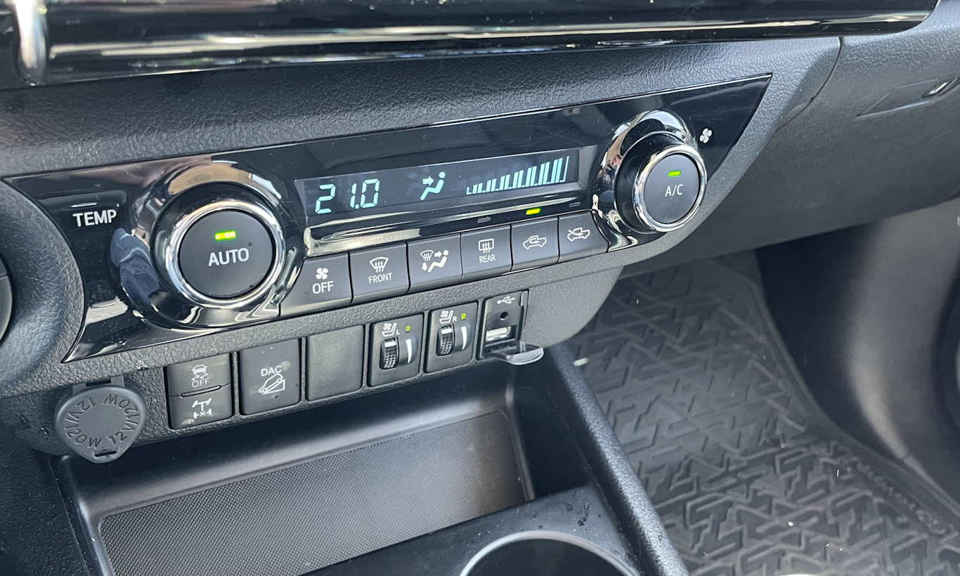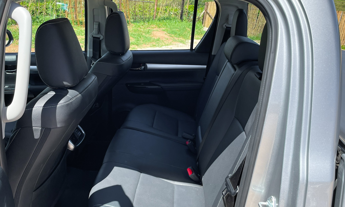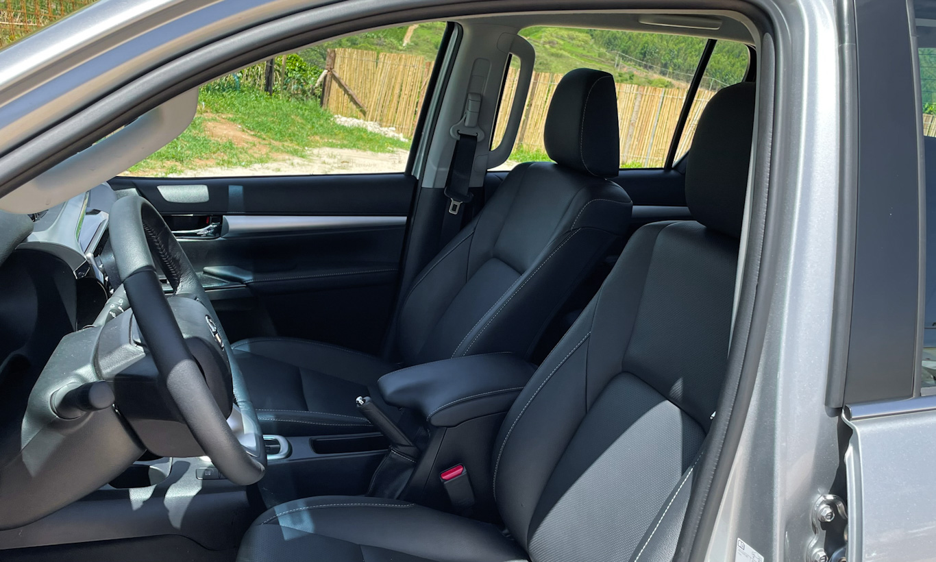 Para apreciação dos passageiros dianteiros, a Hilux SRX tem bancos ventilados, que ajudam bastante em dias de calor. Há ainda porta-copos na frente das saídas de ar, o que ajuda na hora de manter as bebidas geladas. A picape ainda tem retrovisores com rebatimento elétrico, revestimento de couro nos bancos com regulagem elétrica na dianteira e chave presencial.