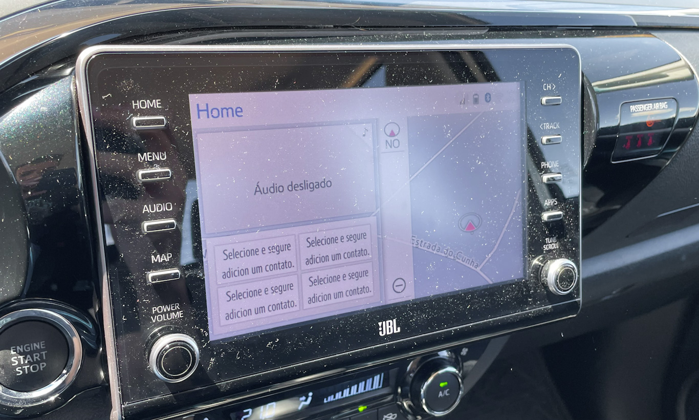 A central multimídia é a mesma do Corolla antes da crise dos semicondutores, mas que ainda está presente no Corolla Cross. Ela tem tela de definição apenas ok, puxando para ruim. O layout é um tanto quanto confuso, mas a velocidade é boa. Tem TV digital como diferencial, além de Android Auto e Apple CarPlay, mas conectados via cabo.