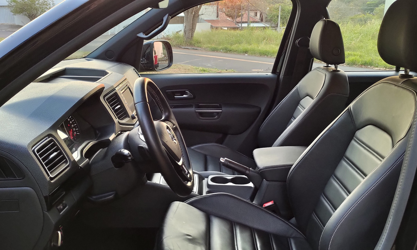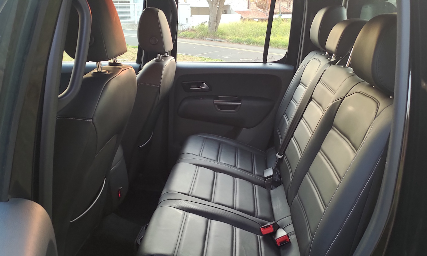 Os bancos são confortáveis e revestidos com couro de ótima qualidade. Dignos de modelos premium. Há ajuste elétrico para motorista e passageiro, além de regulagem de comprimento do assento. Espaço traseiro é acanhado e apertado, mas típico de picapes dessa categoria.