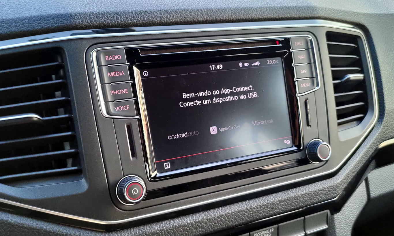 Lançada em 2010 e reestilizada somente uma vez desde então, a Volkswagen Amarok já mostra claros sinais de idade na cabine. Há somente uma entrada USB contra três do tipo 12V, que praticamente ninguém usa. Além disso, a central multimídia é minúscula e tem tela com definição ruim. Mas pelo menos tem Android Auto e Apple CarPlay.