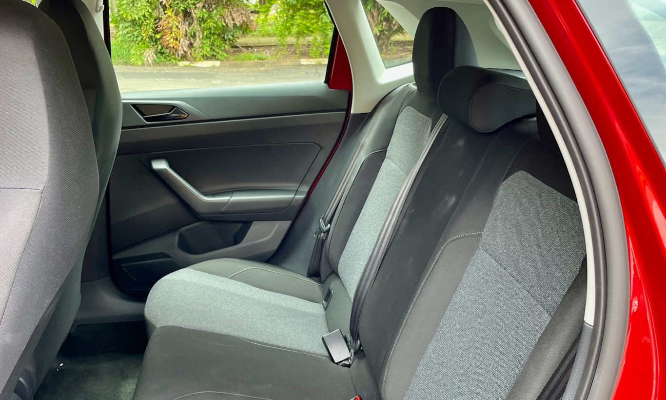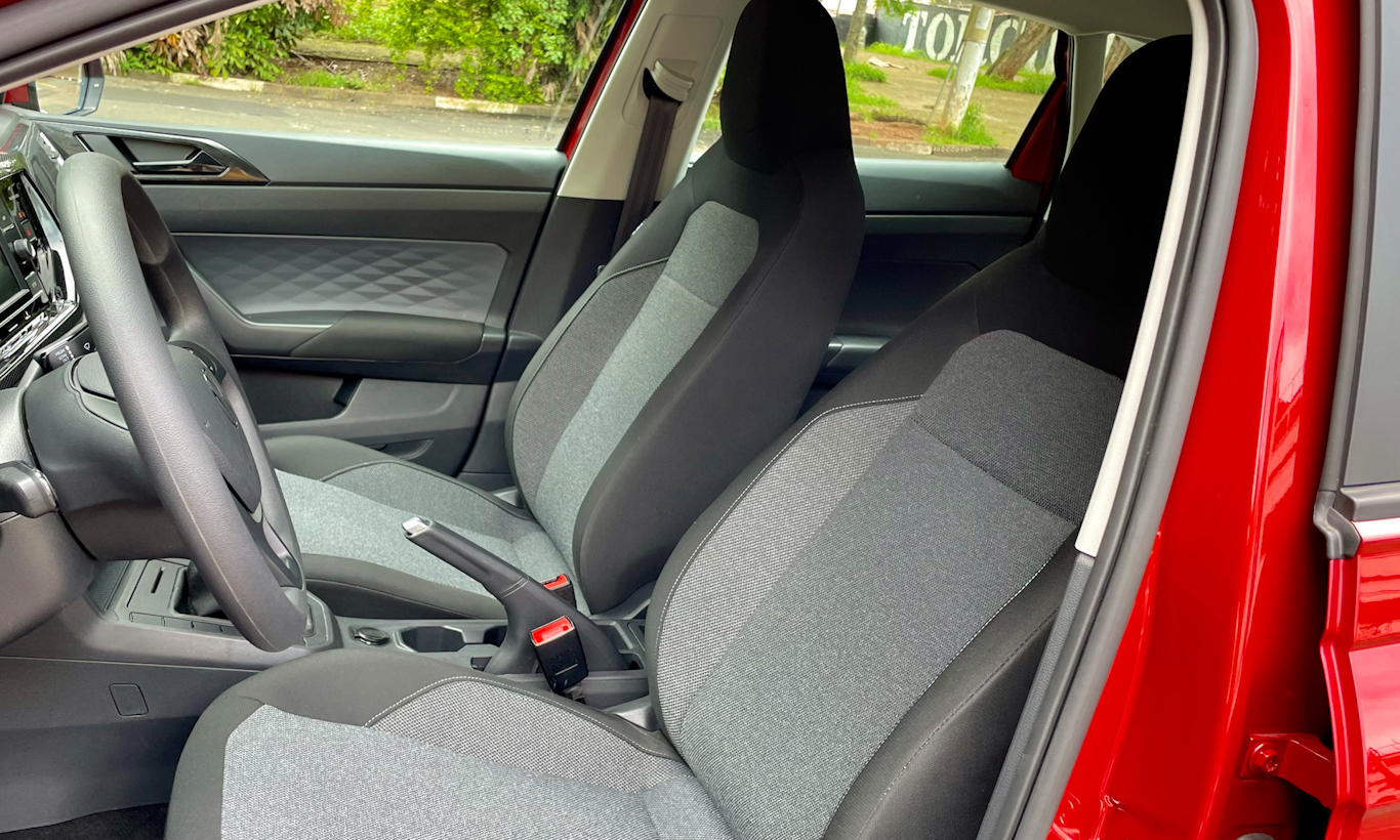 Outro ponto também em que o Polo TSI é apenas ok é sua lista de itens de série. Ele se destaca por ter quatro airbags e faróis full-LED, mas fora isso, nada de luxo. Não há regulagem no volante de nenhuma maneira, mas banco do motorista tem regulagem de altura e o cinto também pode ser ajustado.