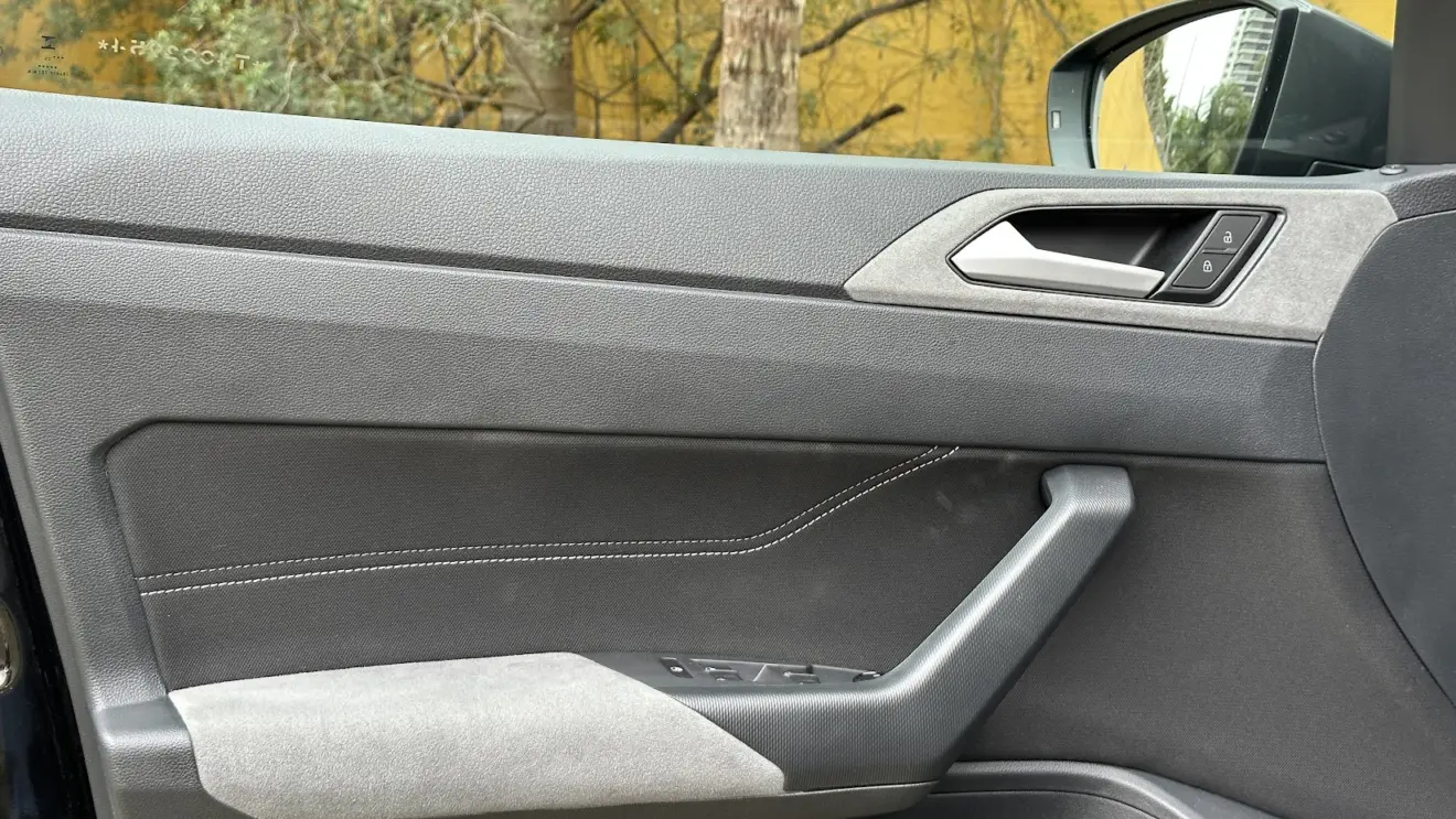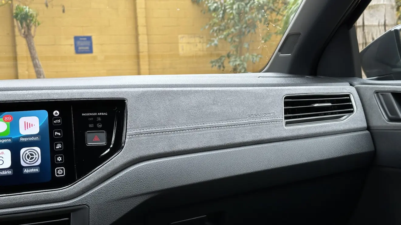 No habitáculo, predominam plásticos duros, embora bem montados. Não há como escapar: o Virtus compartilha a mesma base do Polo, e, como se diz, não existe almoço grátis. O toque de refinamento fica por conta da área revestida em suede no painel, em parte das laterais de portas e nos bancos, com costuras no estilo diamante, sendo agradável ao toque.