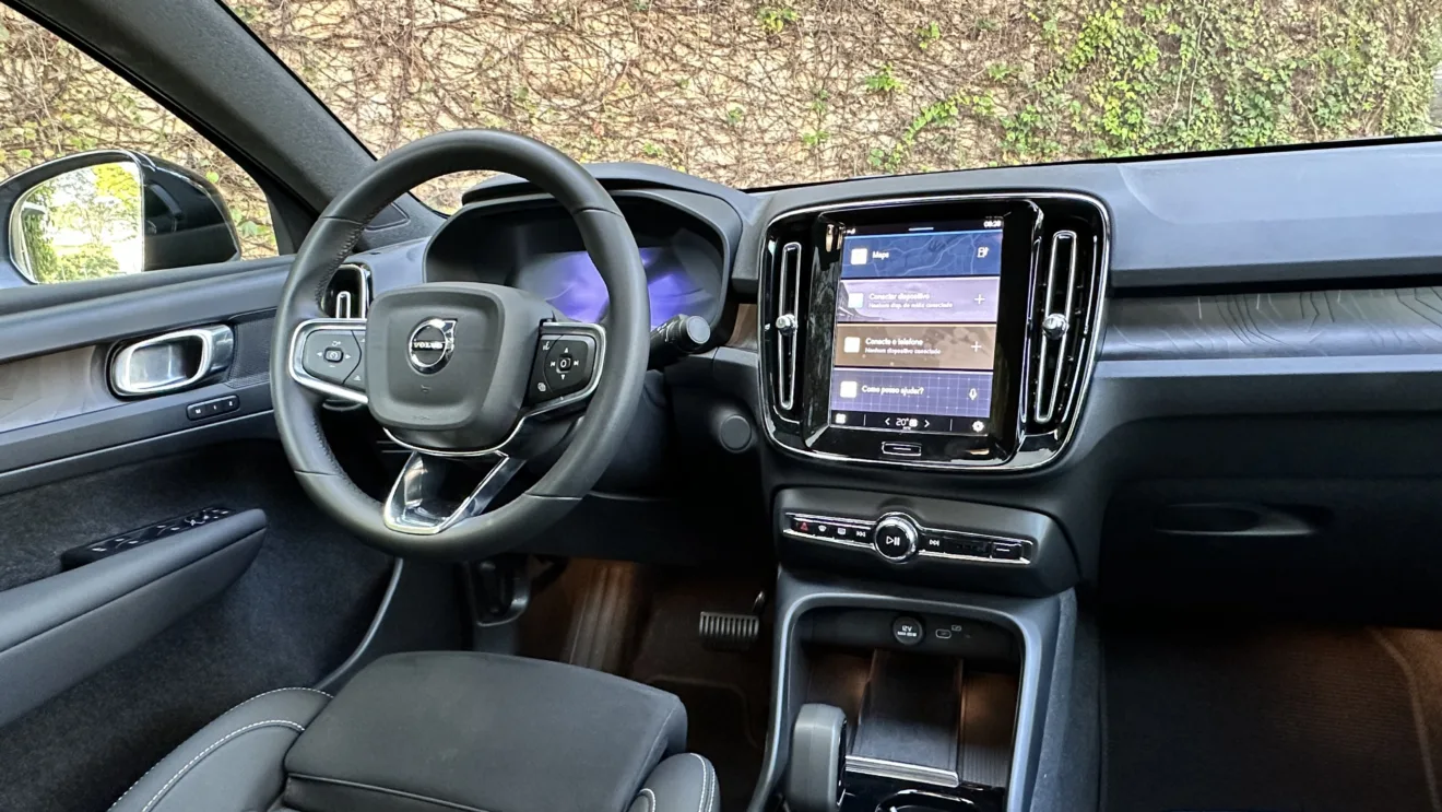 Uma vez dentro, o refinamento é comum nos modelos da Volvo e o habitáculo utiliza em grande parte materiais reciclados, além dos acabamentos semelhantes a metais serem feitos de plástico.