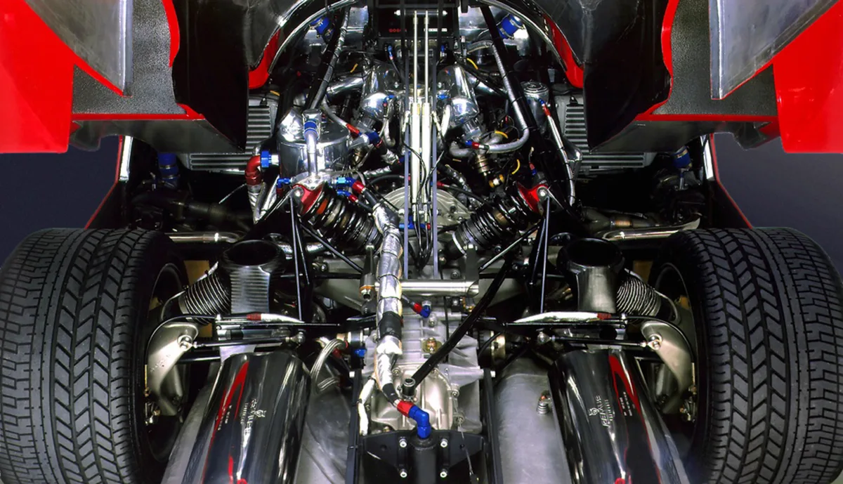 A versão de rua era equipada com um motor boxer de seis cilindros, 3 litros, biturbo, de 720 cv. Detalhe: se a potência não lhe parece tão assustadora hoje, o peso do carro parecia de Uno: 1.130 kg. Resultado: ele fazia 0 a 100 km/h em 2,8 segundos. E 0 a 200 km/h em pouco mais de 7 segundos.