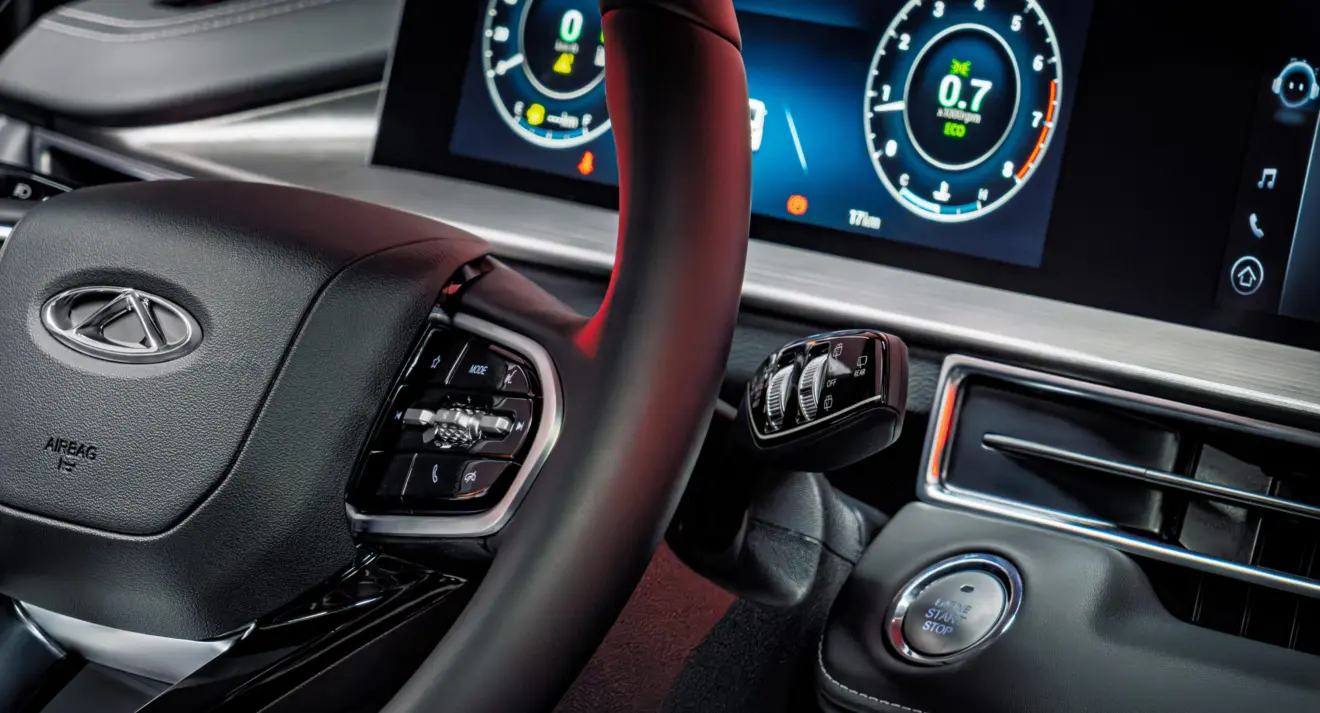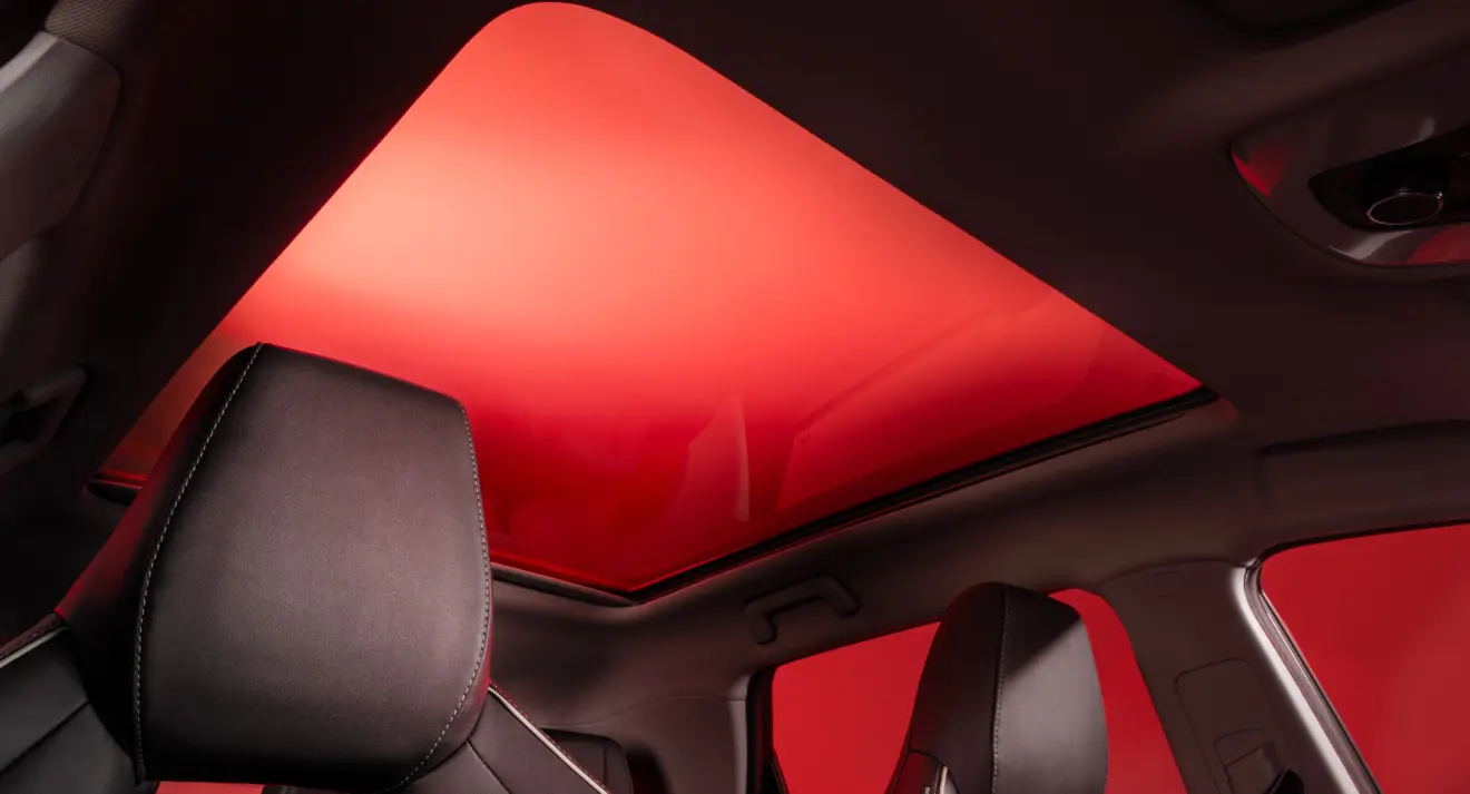 No interior, painel de 20,5 pol. integra quadro de instrumentos digital e central multimídia com conexão sem fio para Android Auto e Apple CarPlay. Há carregador de celular por indução de 50 W, banco do motorista com ajustes elétricos e apoio lombar, sensor frontal de estacionamento e teto solar panorâmico.