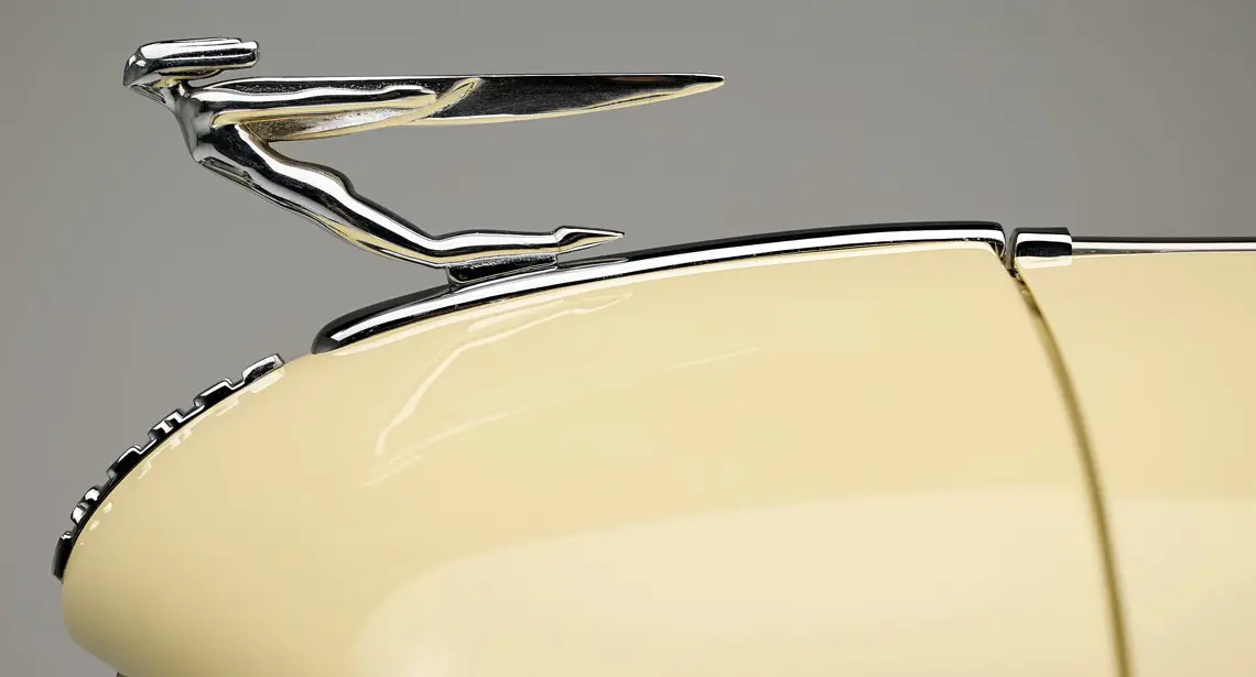 Com carroceria assinada por Gordon Buehrig, responsável pelo Duesenberg Model J, o adorno de capô do Auburn 851 Supercharged Cabriolet 1935 é um dos mais impressionantes da era Art Déco. Produzido em cromo polido, era chamado de Auburn Flying Lady: uma figura feminina em posição de voo, com os braços estendidos para frente.