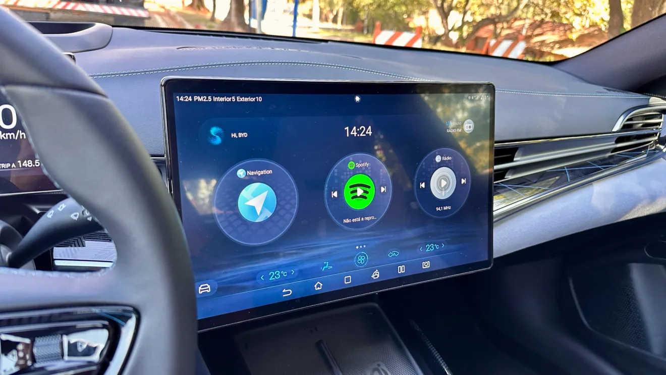 O BYD Seal traz uma das maiores centrais multimídia do mercado, com tela sensível ao toque giratória de 15,6 polegadas e resolução Full HD (1920×1080). Permite uso dividido para diferentes funções e conta com Apple CarPlay e Android Auto sem fio.