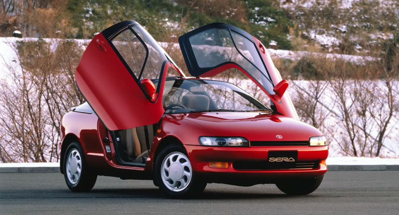 Criado a partir do protótipo Toyota AXV-II, este hatchback retro-futurista foi produzido pela Toyota de 1990 a 1996. O diferencial do Sera estava nos quatro lugares e nas duas portas borboletas, sendo o único carro do fabricante a oferecer esse estilo de porta. O propulsor de quatro cilindros, 1.5 litros e 16 válvulas, rendia 111,5 cv de potência, com opções de câmbio manual de cinco marchas ou automático de quatro velocidades.