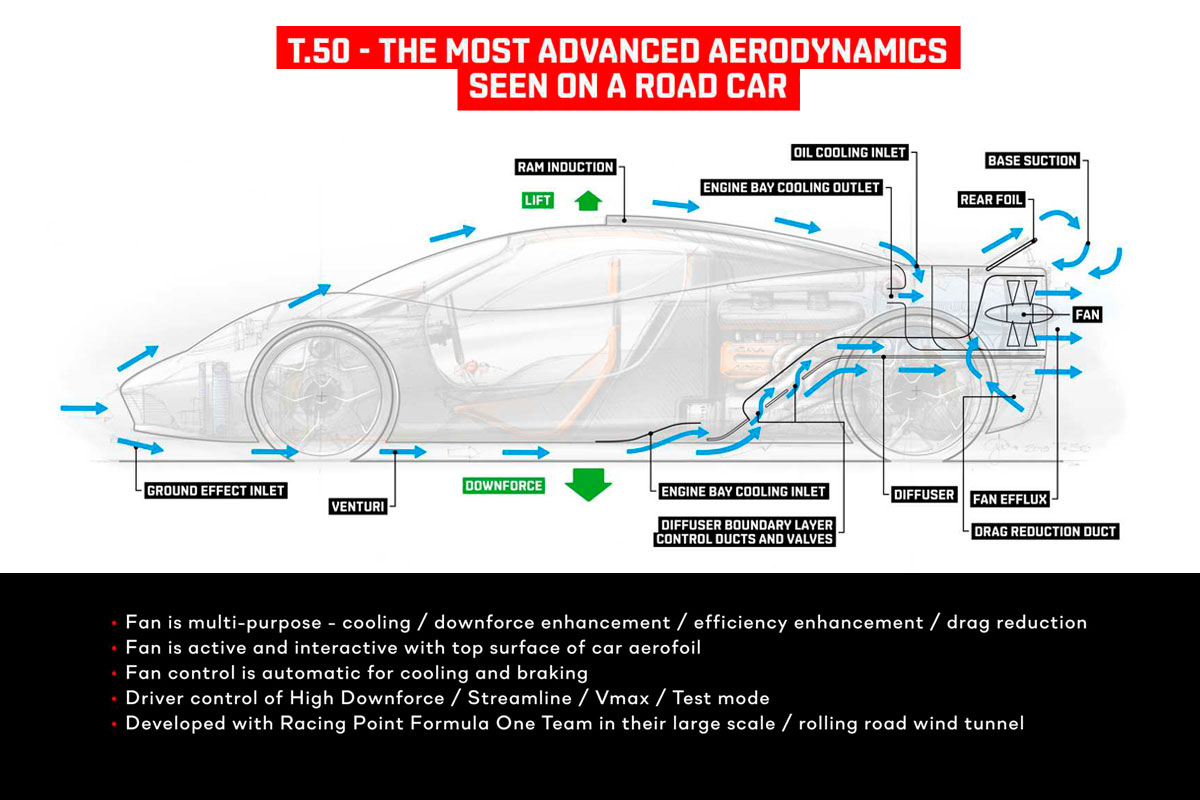 Mesmo não dispondo de um motor mais moderno com tecnologia híbrida ou coisas do gênero, o T.50 terá um enorme “ventilador” traseiro que, segundo Murray, vai ajudar o T.50 a ter um sistema ativo de downforce, com níveis variáveis de acordo com a necessidade e o modo de condução escolhido.