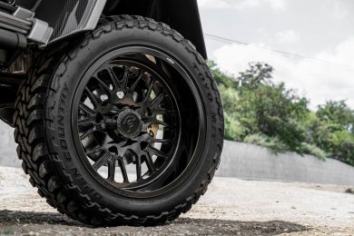 Por falar nas rodas, o SUV ganhou um conjunto de 24 polegadas da grife americana Forgiatto, que são calçadas com generosos pneus Toyo de 37 polegadas. Além das novas “redondas”, chama a atenção no visual a pintura preto fosco e a retirada dos detalhes cromados que apareciam nas maçanetas, frisos, grade dianteira e emblemas. Há ainda acabamento de fibra de carbono nos para-lamas e luzes auxiliares no teto, bem como uma película bem escura nos vidros.