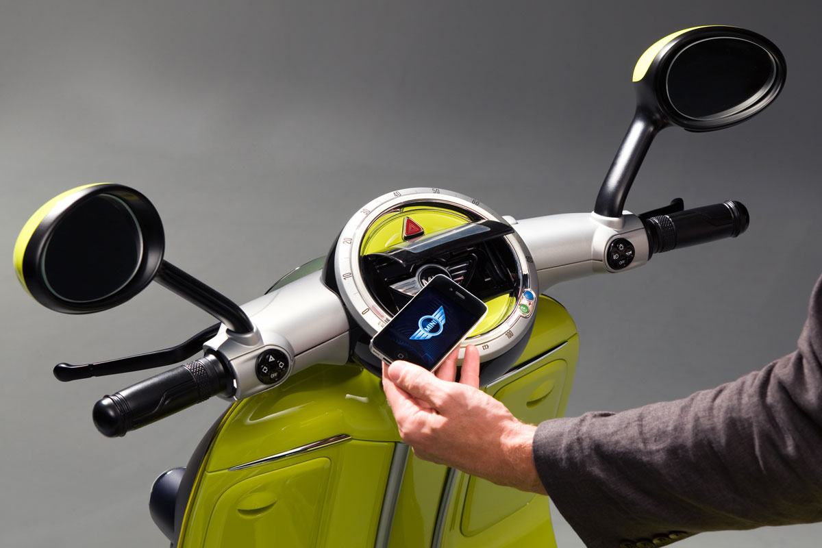 MINI Scooter E Concept (divulgação)Outra característica de destaque do MINI Scooter E Concept: a forma inovadora de integrar dispositivos móveis, algo inédito para a época. O painel, de forma arredondada e inspirado no design do mostrador circular incorporado ao instrumento central dos veículos MINI, foi desenvolvido para acomodar um smartphone.