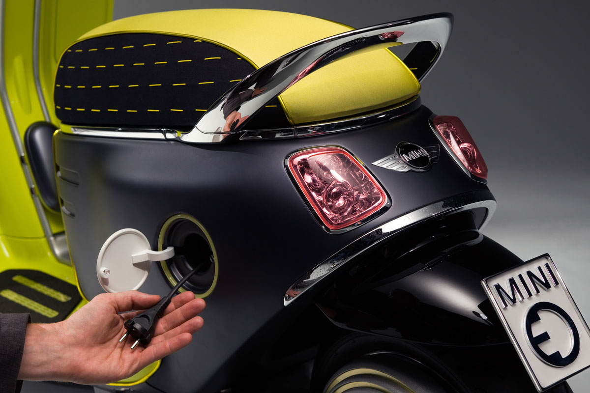 Impulsionado por um motor elétrico integrado à roda traseira, o MINI Scooter E Concept traz baterias de íons de lítio compactas, aptas a serem recarregadas em tomadas de energia domésticas convencionais com a ajuda de um cabo de carregamento integrado à parte traseira da motocicleta.