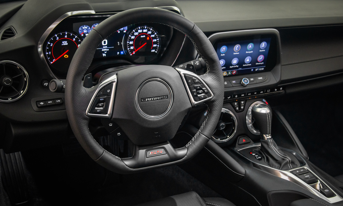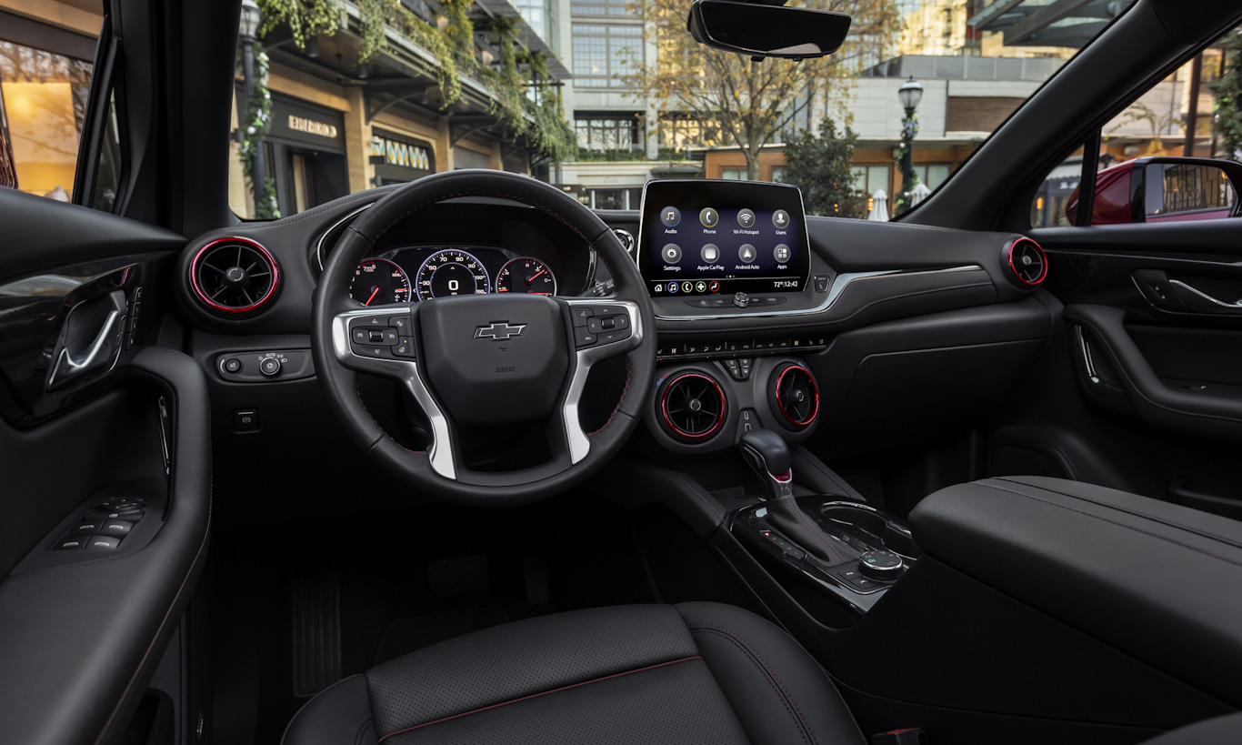 Contudo, é na cabine que Blazer e Camaro mostram seu parentesco. As saídas de ar circulares e baixas, posicionadas logo à frente da manopla de câmbio, são as mesmas entre os dois modelos. Até mesmo o visual geral do painel é compartilhado entre eles. Ainda assim, o volante é diferente, deixando o Blazer com mais pose de SUV.