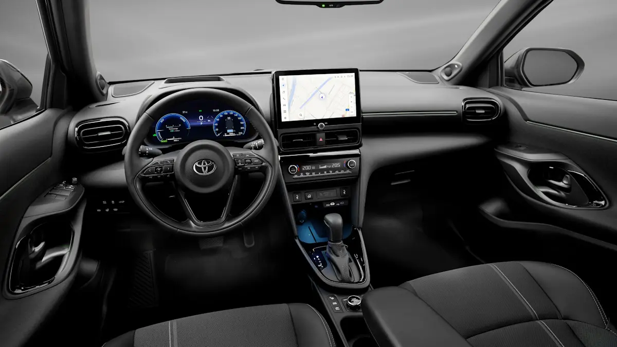 Por dentro, o console central desenha um grande Y onde divide o painel em dois andares. A central multimídia flutuante fica em posição bem alta, enquanto o volante é o mesmo do GR Corolla e o painel é o mesmo das versões de entrada do Corolla sedan. Atualmente, o Toyota Yaris Cross XP210 é fabricado no Japão e na França.