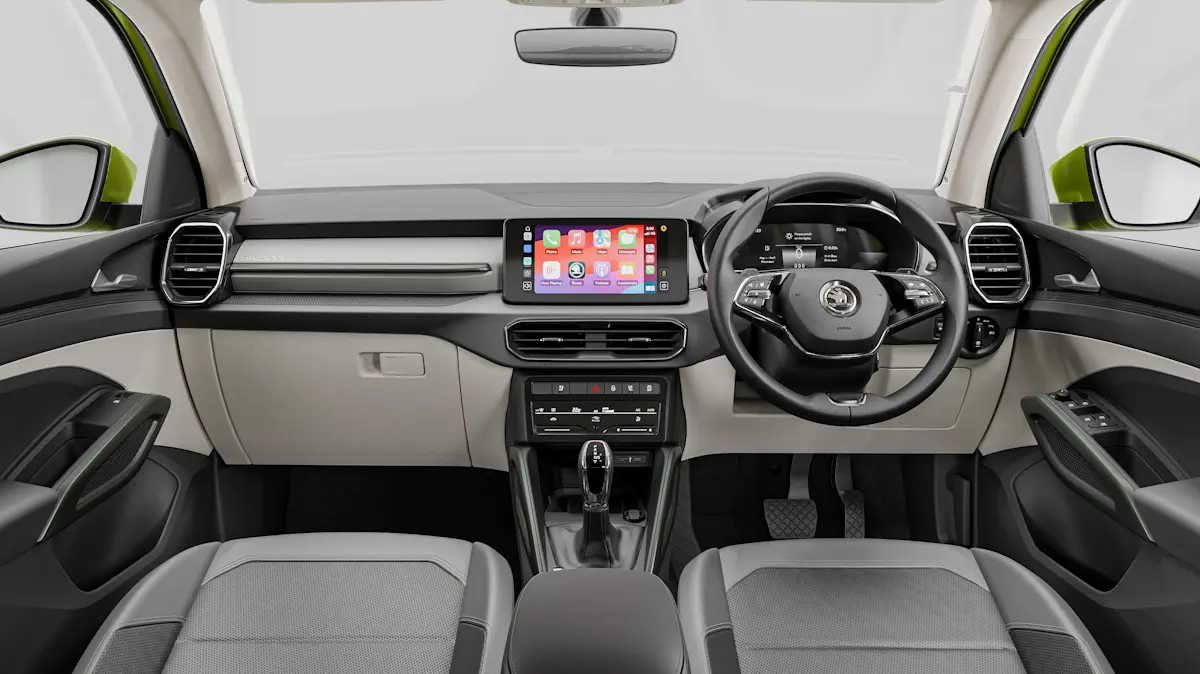 Por dentro, Skoda Kylaq e Volkswagen Tera têm layout idêntico. As saídas de ar estão nos mesmos lugares,assim como comandos e central multimídia. A maçaneta é a mesma, assim como o painel de instrumentos totalmente digital. O Skoda não tem partes macias no painel como o VW, mas tem saída de ar traseira.