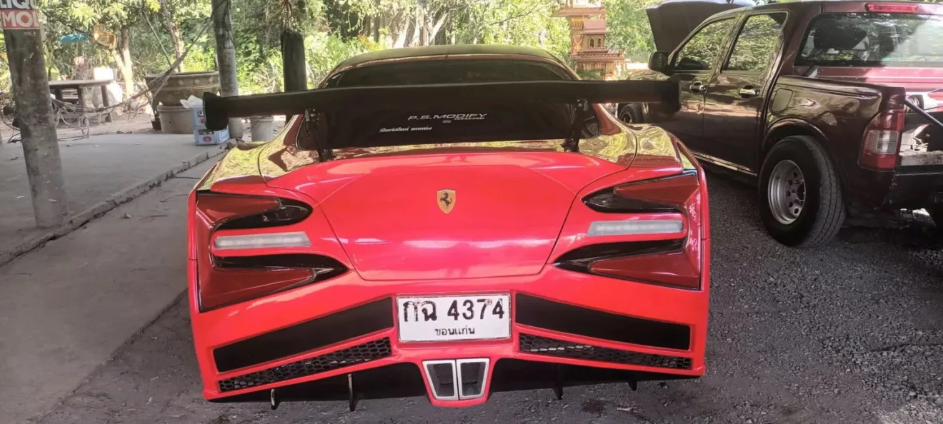 Porém, o Toyota Celica que tenta ser uma réplica da Ferrari F12 Berlinetta se perde completamente na traseira. A janela é inclinada, dando ar de esportividade. Mas, o aerofólio enorme e a pequena tampa do porta-malas não se conversam. Além disso, as lanternas possuem formato da letra “C” e possuem contorno escurecido.