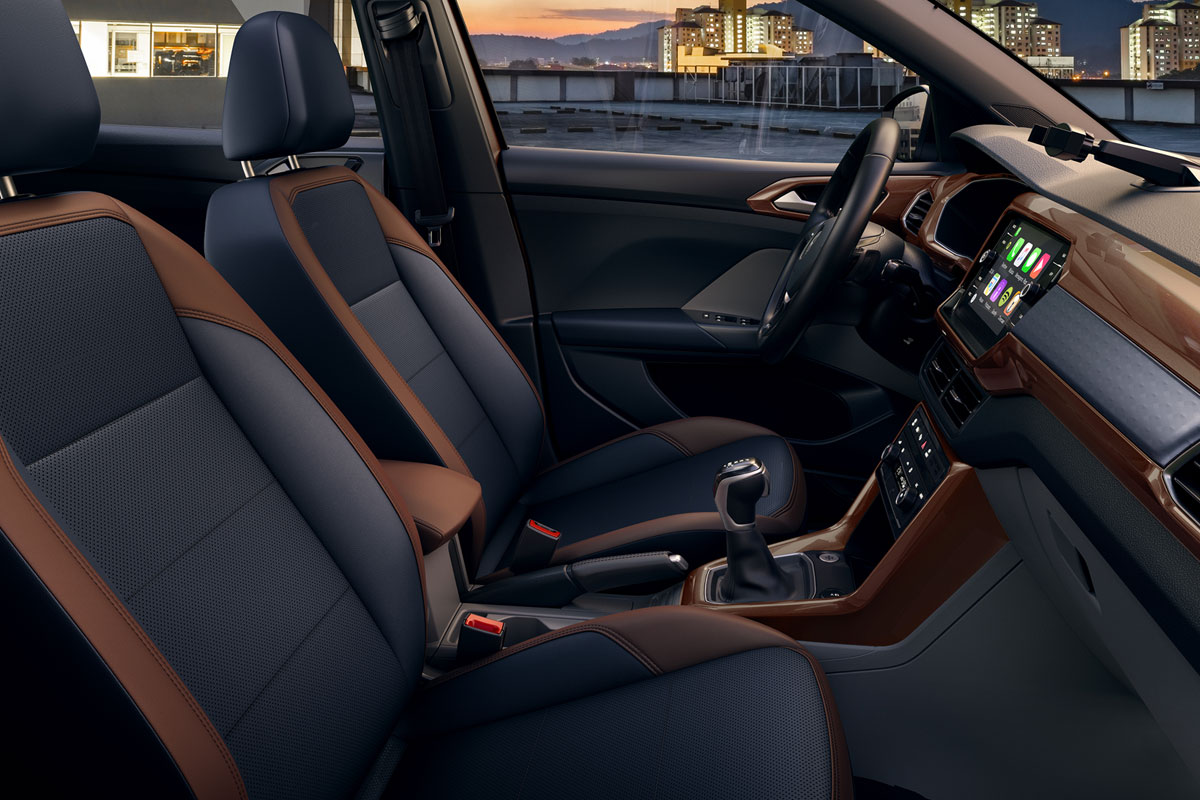 T-Cross 200 TSI (R$ 84.990): traz seis airbags, ar-condicionado, assistente de partida em rampa, banco do motorista com ajuste de altura, bancos de tecido, volante multifuncional com regulagem de altura e distância, direção elétrica, vidros elétricos, computador de bordo, controle de estabilidade e tração, bloqueio eletrônico do diferencial, retrovisores com ajuste elétrico e setas integradas, faróis de neblina com cornering light (acompanham curvas) e sistema ISOFIX. Tem ainda faróis com luzes diurnas em LED, lanternas em LED, rodas de liga leve de 16″ com pneus 205/60 de baixa resistência a rolagem, rack de teto, acendimento automático dos faróis, sensor de estacionamento, alarme anti-furto com comando remoto, sistema de som Media Plus com conexão Bluetooth e entrada USB e suporte para smartphone com entrada USB.