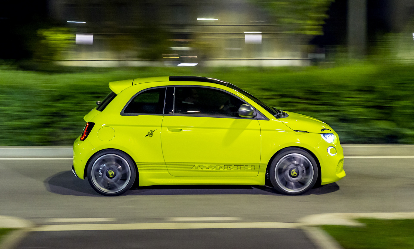 Nas laterais, destaque para as rodas de 18 polegadas, a capa dos retrovisores em cinza e um adesivo na parte inferior da carroceria, com o nome da marca escrito. Após a porta tem o escorpião junto de um raio, indicando ser o primeiro Abarth elétrico. O teto é pintado em preto. De traseira, as mudanças ficam pelo nome da marca, lanternas escurecidas e um para-choque traseiro com novo difusor de ar.