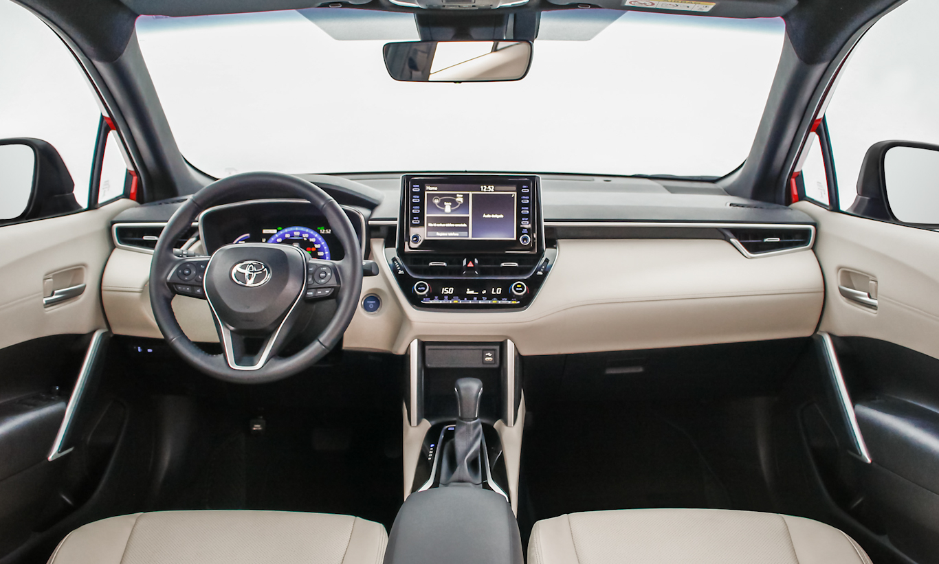 Por dentro, pequenas e sutis mudanças. O Toyota Corolla Cross 2025 recebeu nova central multimídia com tela maior e melhor. Ela acompanha o novo painel de instrumentos totalmente digital vindo do irmão Corolla sedã. Há ainda couro de melhor qualidade no painel e nas portas, luz cortesia nas portas e console e freio de estacionamento elétrico.