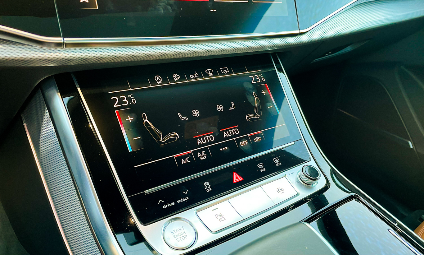 Na tela do ar-condicionado, o Q8 tem diversos atalhos e gestos que podem ser feitos para comandar mais rapidamente o sistema. Basta arrastar a barra de temperatura para um ponto exato para selecionar o grau ou juntar os dois dedos como se tirasse o zoom de uma foto para sincronizar as temperaturas. Genial.