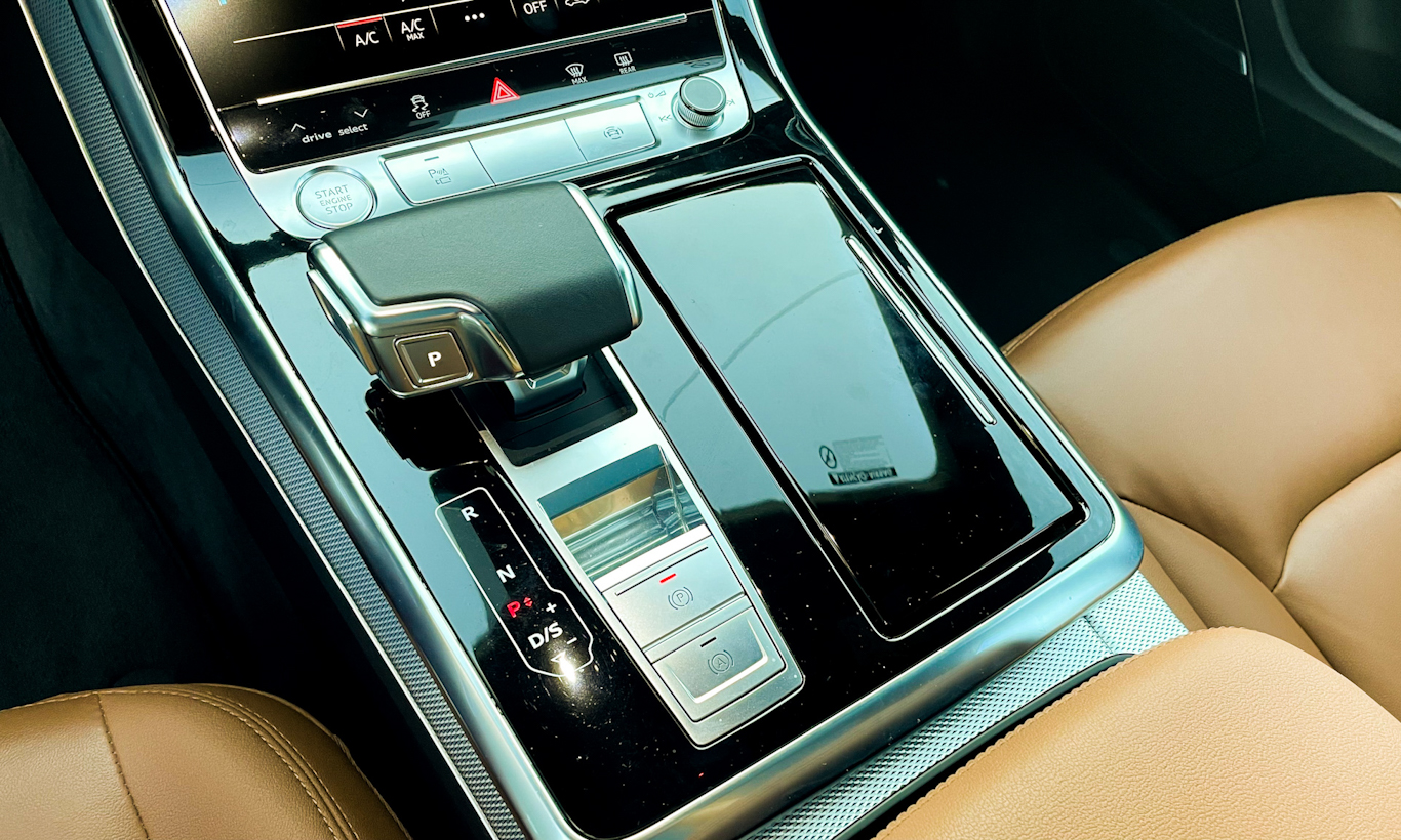 O tamanho extra largo do Q8 fica claro ao perceber que o console central é tão largo que caberia facilmente uma pessoa sentada ali. Ele é alto e divide a cabine em duas zonas individuais para motorista e passageiro. A vantagem é que há bastante espaço para cacarecos variados por ali.