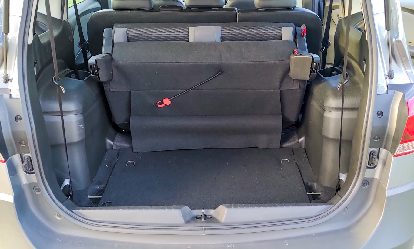 Toda parte traseira da Spin range, sendo evidente a mistura de som de acabamento das portas e do porta-malas com os pontos de fixação do banco traseiro. Este que, aliás, fica pendurado por uma cordinha quando os assentos traseiros não são usados. Artifício necessário para liberar os 553 litros de capacidade do porta-malas (162 litros com os 7 lugares).