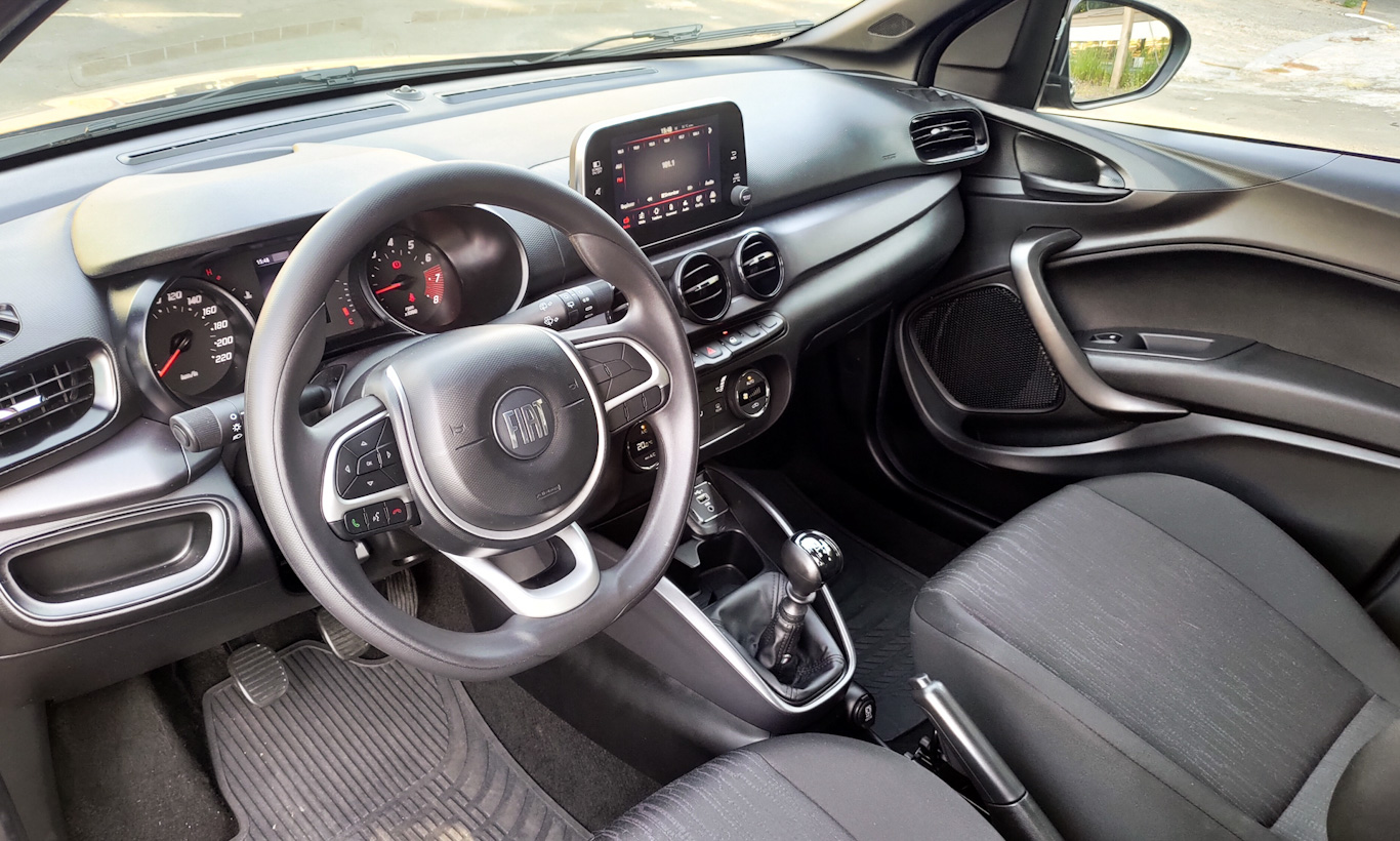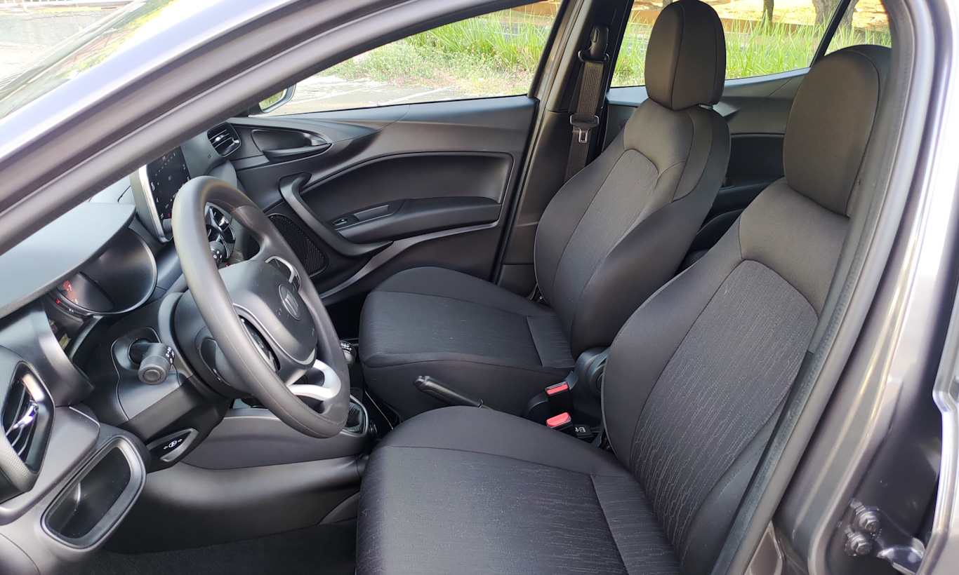 Na cabine, teto com forro preto traz mais sofisticação. Mas os bancos com tecido simples da versão 1.0 sem nome continuam ali. Sem explicação, ele perde o tecido nas portas. Como todo Argo, o interior tem acabamento acima da média.
