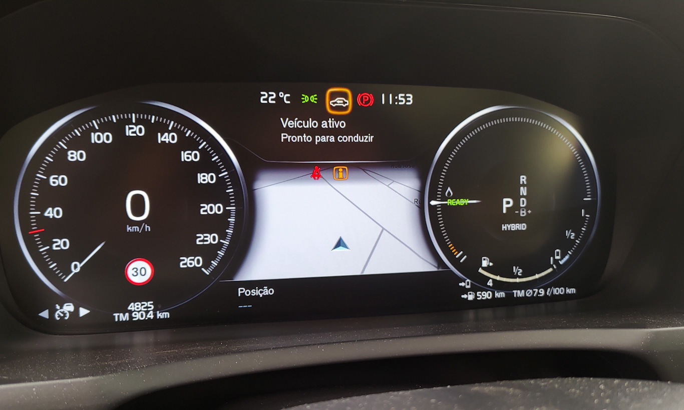 Um dos pontos que mais me agradou é o sistema de alerta de radares com leitor de placa de trânsito. No head-up display o XC90 alerta a velocidade da via e que há um radar em frente, independentemente se você traçou uma rota no GPS ou não. O alerta é feito de maneira sonora e visual, além de ser repetido também no painel de instrumentos.