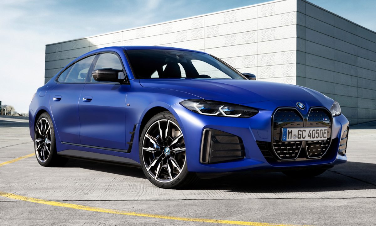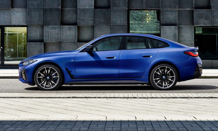 Esteticamente, o BMW i4 se diferencia dos seus irmãos a combustão pela presença de duas portas a mais. Ele é baseado na carroceria Grand Coupé, que traz mais espaço e comprimento maior, mas sem estragar a silhueta cupê. A dianteira carrega grade frontal fechada, mas com o mesmo desenho polêmico. Detalhes em azul marcam a versão elétrica.