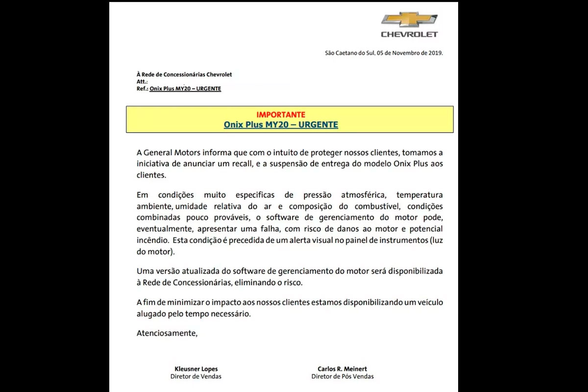 A Chevrolet anunciou recall e suspensão das vendas do novo Onix Plus. O motivo foi o caso confirmado de incêndio de uma unidade ocorrida no estado do Maranhão. Aparentemente não se trata de um caso isolado.