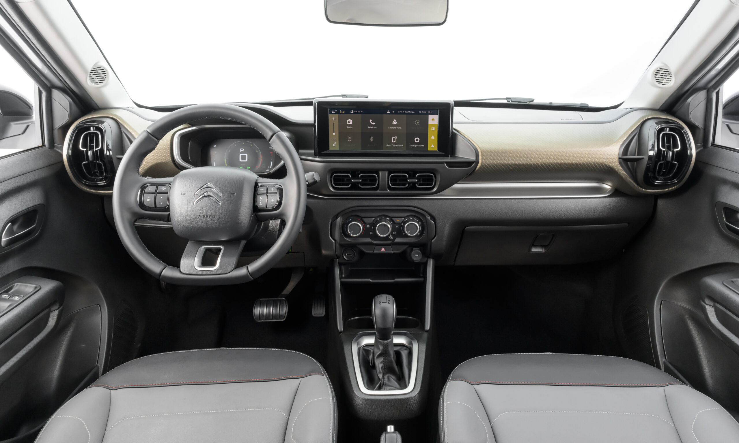 Na cabine, o Aircross recebe painel de instrumentos digital com tela mais simples que a dos Fiat. Há ainda painel com faixa com textura inspiradora no logo da Citroën na cor marrom. Ela é acompanhada por uma faixa prata na parte inferior. O volante traz comandos novos por conta do piloto automático e do painel.