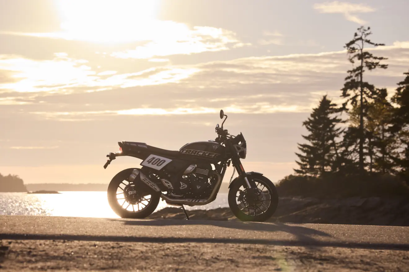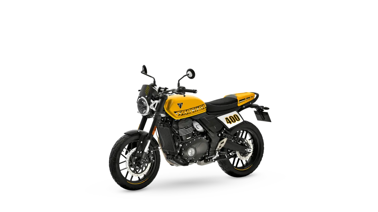O design remete diretamente às pistas americanas, com tanque de linhas retas, number plate lateral, rabeta curta com cobertura de banco e grafismos inspirados em competição. Detalhes como o farol redondo em LED e o perfil clássico do motor garantem que, mesmo ousada, a Tracker 400 seja reconhecida instantaneamente como uma Triumph Modern Classic.