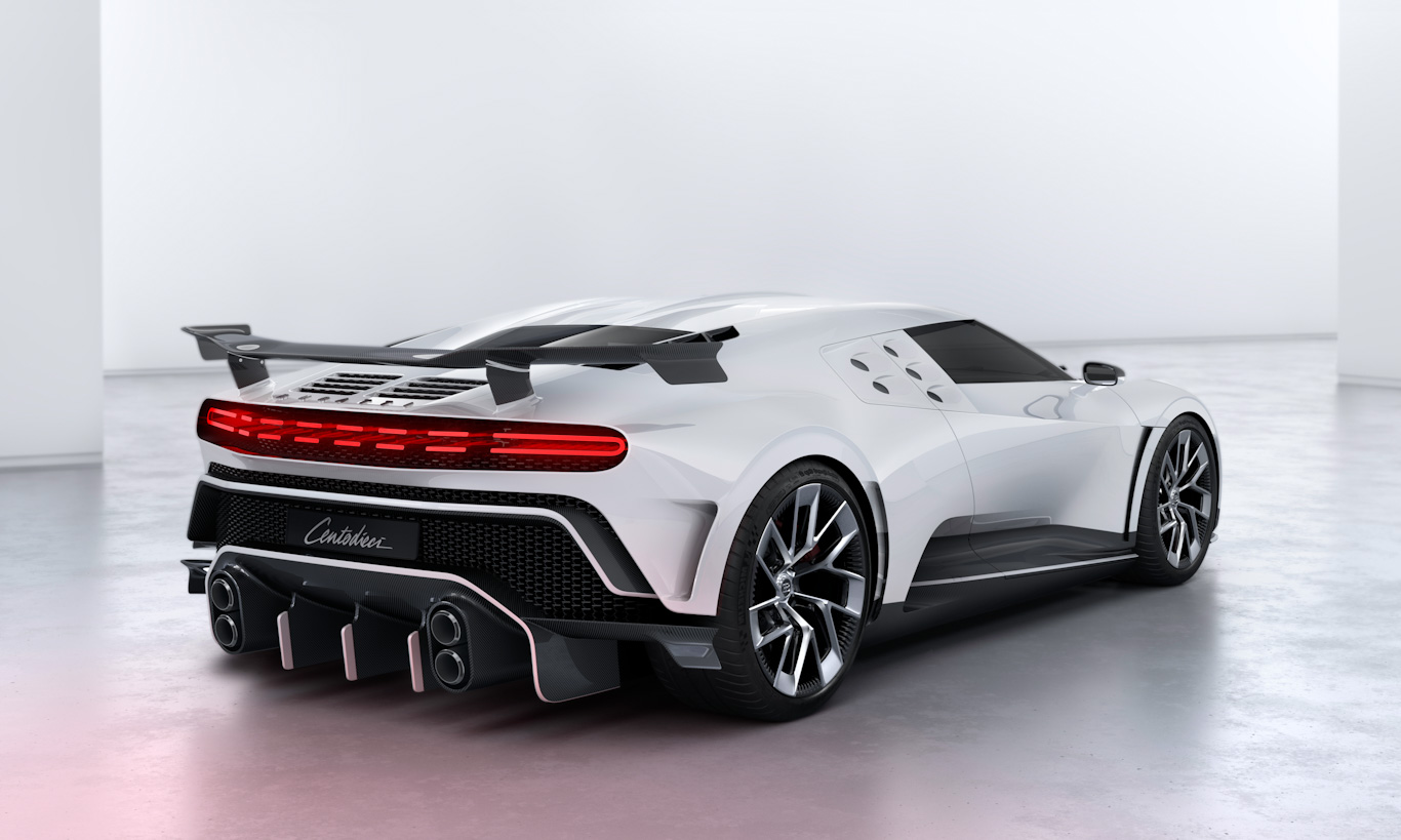 Na traseira, a Bugatti reinterpretou as saídas de ar ovais como parte das lanternas traseiras totalmente feitas em LED. Um grande aerofólio em cor contrastante ajuda a dar um toque de esportividade a mais no novo modelo, que tem linhas mais fortes e radicais que seu antecessor.