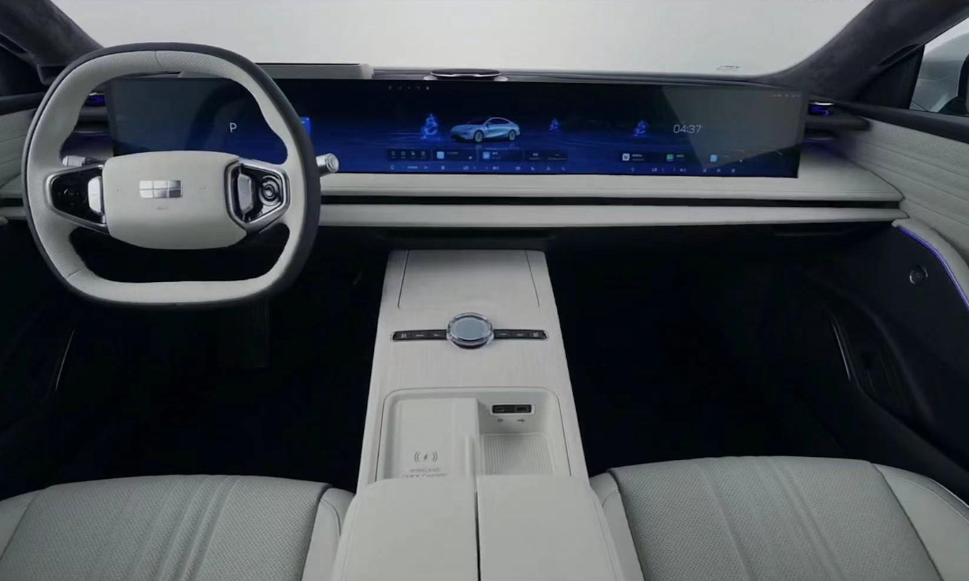Por dentro, ele traz uma tela de 45 polegadas com resolução 8K atravessando todo o painel. Ela é dividida em módulos para o painel de instrumentos, central multimídia principal e sessão secundária para o passageiro. Contudo, ao contrário de outros carros que fazem essa integração visual, no Geely Galaxy E8, tudo é uma tela só.