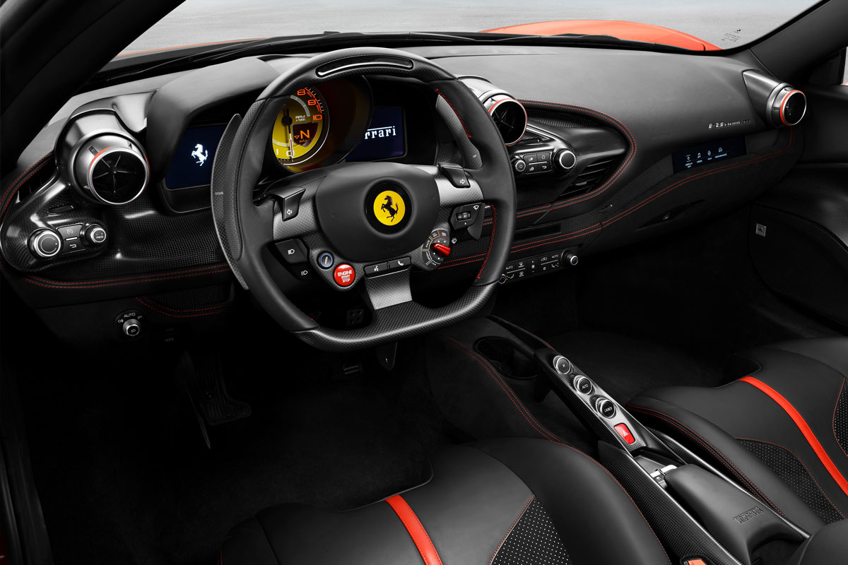 Na estética, a F8 Tributo tem novo conjunto ótico dianteiro. Atrás, as tradicionais lanternas redondas duplas estão de volta. Por dentro, mais novidades, como o novo volante e as saídas de ar – agora redondas. Os controles que ficam no painel também têm novo desenho e garantem um visual mais moderno.
