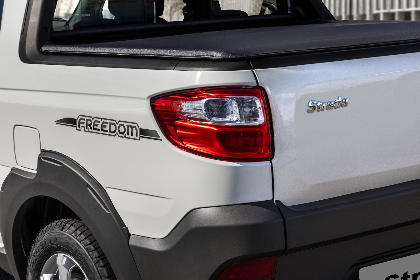 De série, a picapinha traz de série rodas de liga leve de 14 polegadas, faróis de neblina, para-choque com skid plate, capota marítima e sensor de estacionamento. Há ainda vidros, travas e retrovisores elétricos, volante multifuncional revestido de couro, rádio com entrada USB e bancos de tecido com logo “Freedom” bordado no encosto.