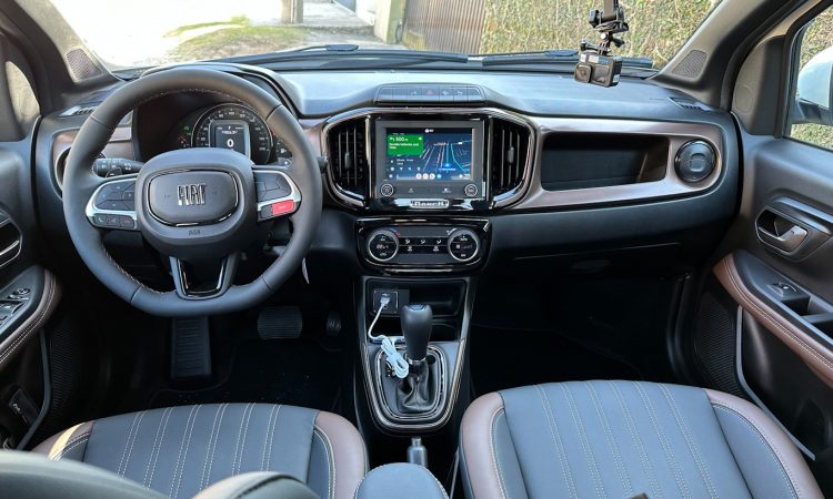 No quesito acabamento, a Fiat Strada manda bem. Tem plásticos de qualidade e bem encaixados, além das típicas texturas criativas da marca italiana. Há couro agora nos apoios de braço laterais para as versões Ultra e Ranch. Confesso que o acabamento da Ranch chama mais atenção que o da Ultra.