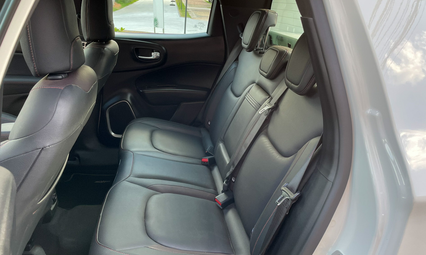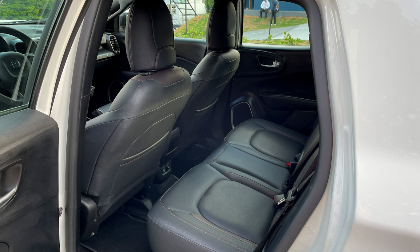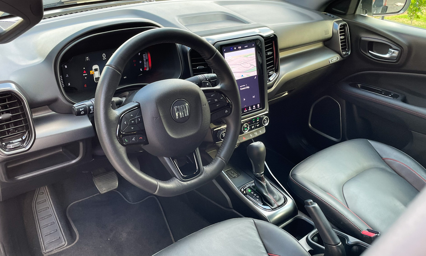 Na versão Ultra, a Fiat deu à Toro bancos revestidos em couro com discretos detalhes em vermelho. Traz uma sofisticação a mais sem exagero. Afinal, essa não é uma versão Abarth da picape. Na traseira, o banco curto e reto torna viagens longas não tão confortáveis e a ausência de saída de ar por lá incomoda.
