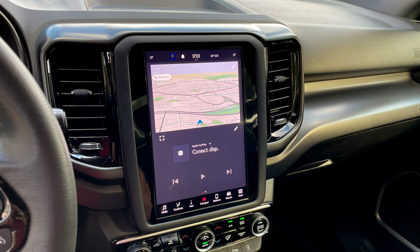 Visualmente chama atenção a central multimídia vertical. A tela tem ótima definição e menus claros e fáceis de usar, apesar de exigir a entrada em diversos submenus para fazer até operações mais simples. A velocidade do sistema também é elogiável, mesmo quando usando CarPlay ou Android Auto sem fio.