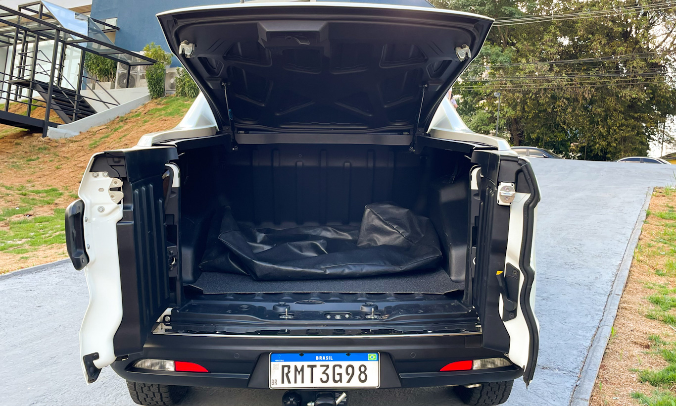 Mas o item único dela está na caçamba. Fechada com uma cobertura de fibra de vidro, a Toro Ultra parece um grande sedã. O único problema é que ele não tem isolamento para a chuva, o que torna, na prática, igual a uma capota marítima, mas menos prático. Ao menos traz um estilo mais parrudo e diferente.